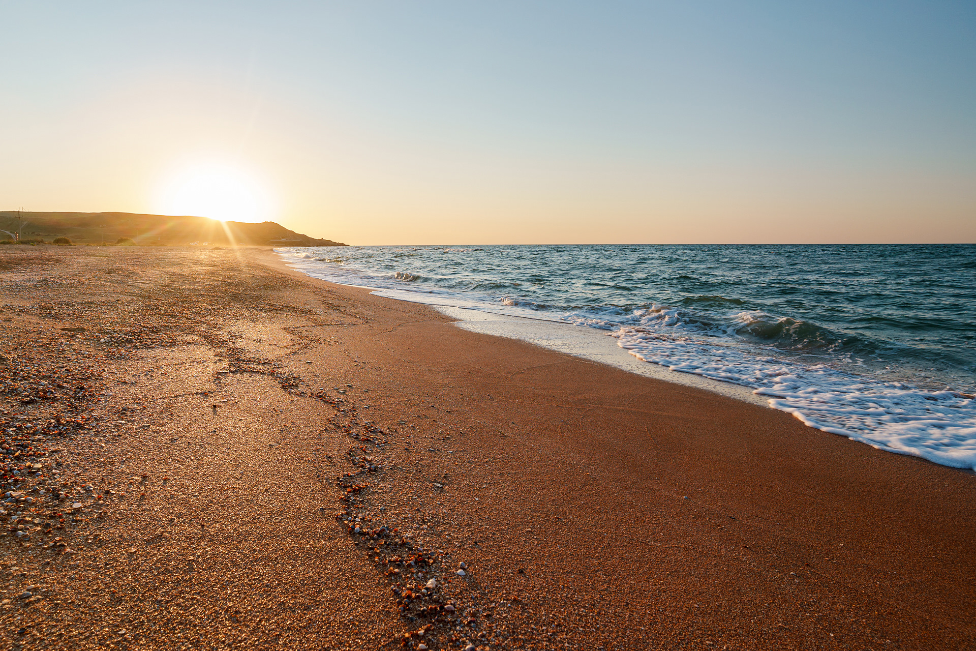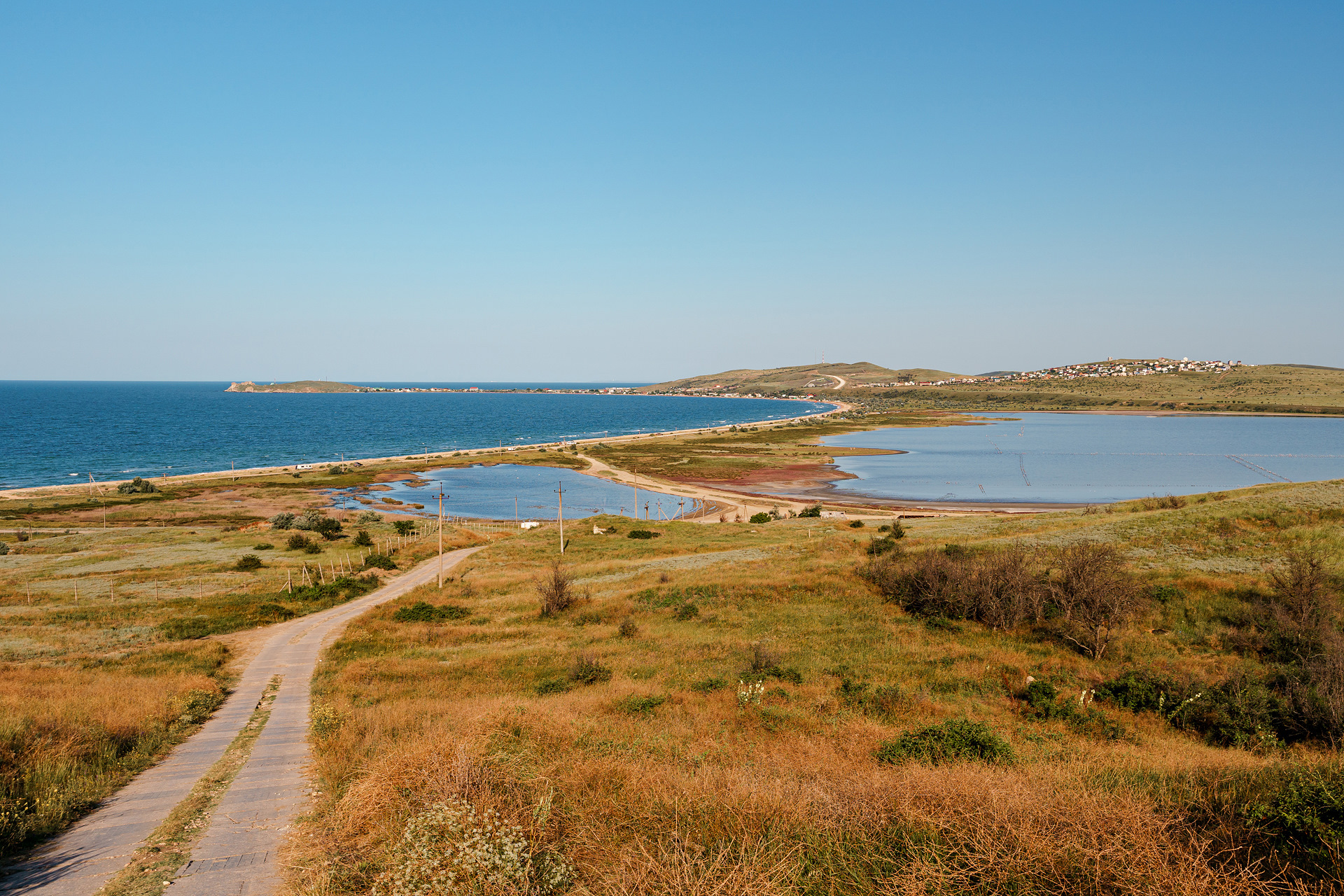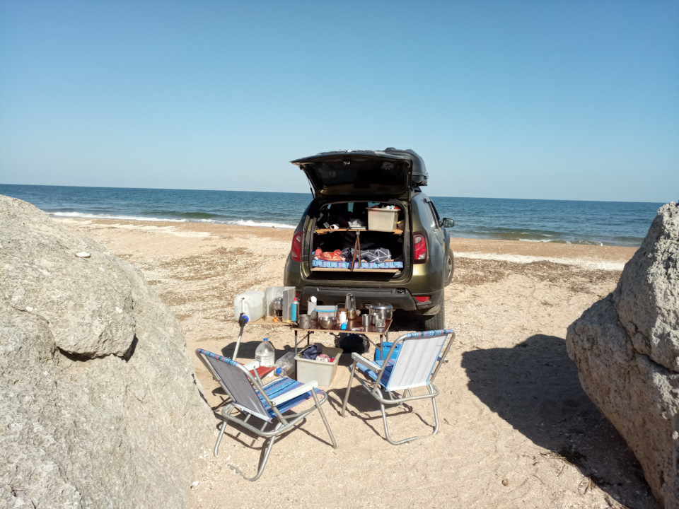Уезжать из кемпинга откровенно не хотелось. Дней пять там можно отдыхать спокойно. Но путешествие подходило к своему закономерному финалу и нужно было ехать поближе к мосту. От плана решили не отклоняться и, проехав насквозь через Караларский природный парк (ака "Генеральские пляжи") от Золотого к Курортному, остановились на пляже бухты Морской пехоты напротив Чокракского озера. Про дорогу по природному парку расскажу в отдельной заметке.