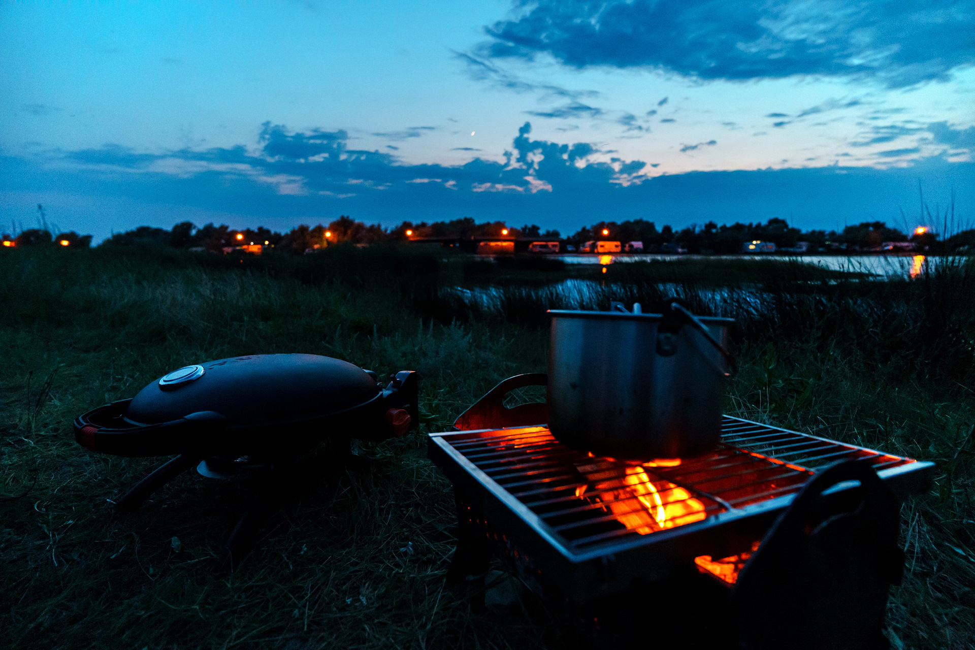 Вечером успели покачаться на волнах тёплого (градусов 28, наверное) Азовского моря и поужинать, нажарив мяса на гриле. Заканчивали ужин уже после заката.