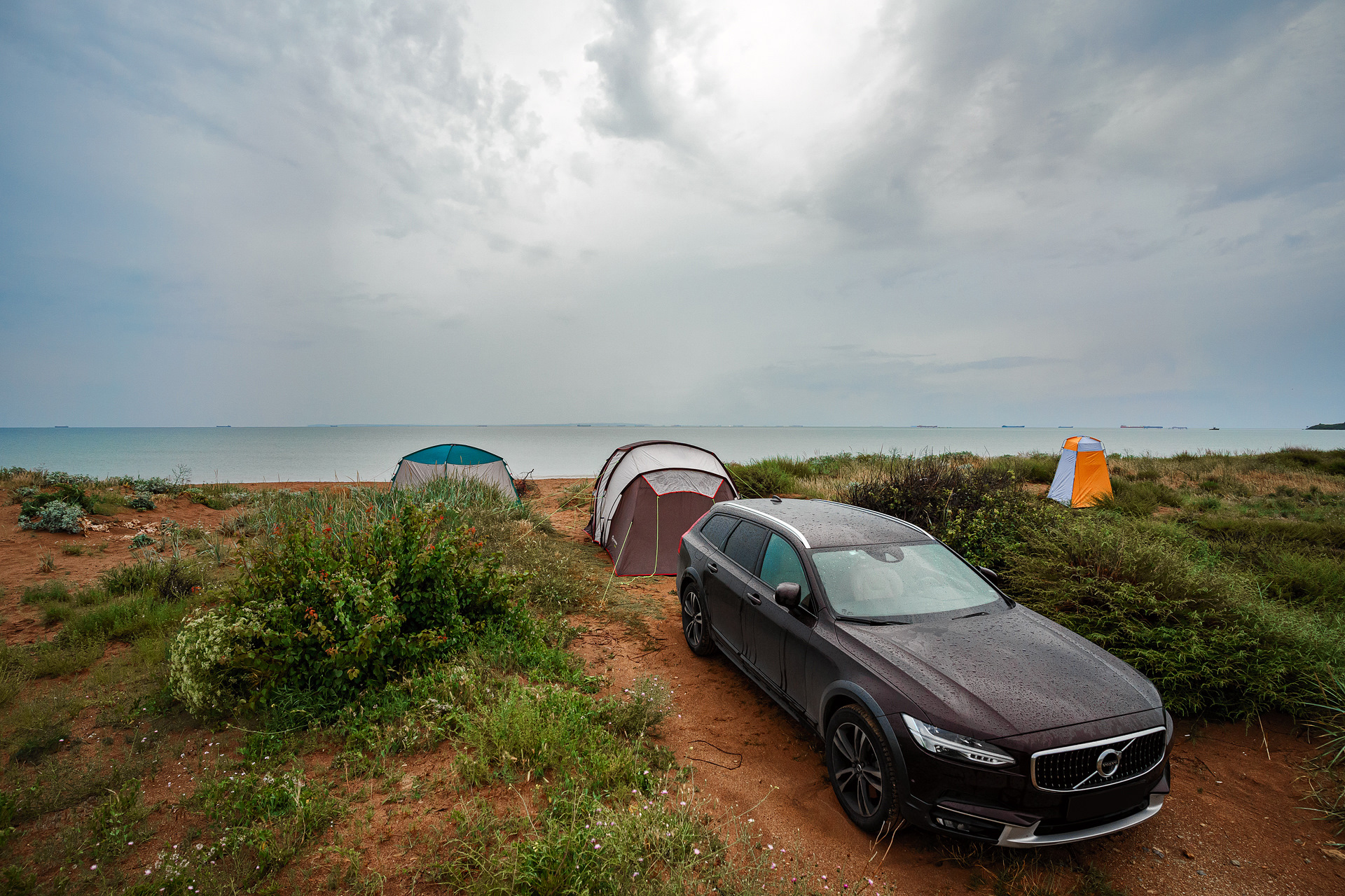 Первая самостоятельная ночёвка была запланирована после Керчи, в самом начале нашего путешествия. Но погода к ночёвке на пляже явно не располагала: два дня шёл дождь — то едва моросил, то лил как из ведра. Мы всё-таки решились ночевать на пляже, но по совету товарищей расположились поближе к Керчи — между Тобечикским озером и морем. Песчаный пляж, тёплое Чёрное море и дождь. Только поставили палатку, как дождь превратился в сильный ливень. Минут через двадцать дождь перестал, и мы закончили установку лагеря. Дождевики не спасли и одежда промокла, из-за чего мы немного замёрзли. Грелись купанием в тёплом море и горячим чаем.