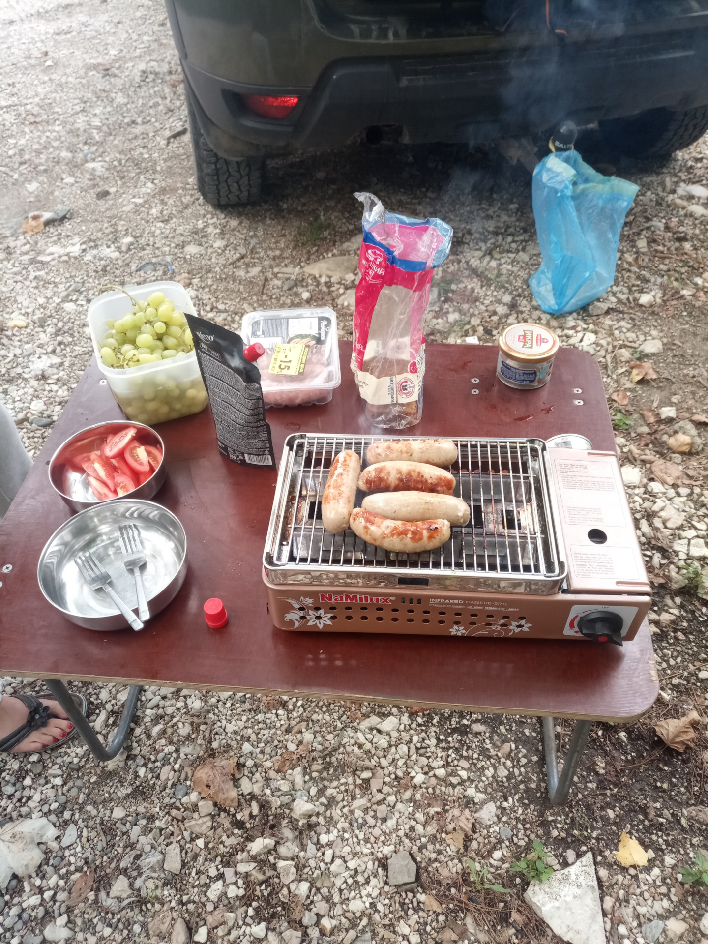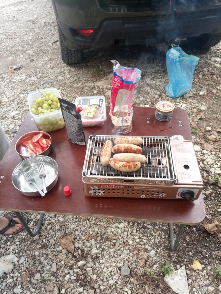 Туристическая плитка — это, конечно, хорошо. Но если каждый раз готовить мясо на мангале, то быстро задолбаешься разжигать угли. Буквально за неделю до отъезда принял решение закупить мобильный газовый гриль. Остановился на O-grill 700T, о котором услышал как раз на драйве. Выбрал среднюю модель, так как у младшей нет встроенного термометра, а размеры старшей мне ни к чему. В комплект к грилю докупил фирменную сумку для переноски. Впечатления от гриля двоякие. С одной стороны, готовить на нём вполне удобно, очищается он достаточно легко, стоимость гриля практически отбилась за это путешествие в виде экономии на обедах/ужинах в кафе. С другой стороны, есть досадные огрехи в качестве изготовления: краска, которой нанесены надписи и маркировка на пластиковых деталях, оказалась нестойкой к растительному маслу, надписи практически стёрлись, маркировка регулятора газа размазалась. Места в багажнике он занимает весьма немало. Но если таскать с собой запас угля к мангалу, то получится что-то сравнимое. Жарили на нём мясо, курицу и овощи, разжаривали готовые блинчики с начинкой на завтрак — получается отлично, при некоторой сноровке.