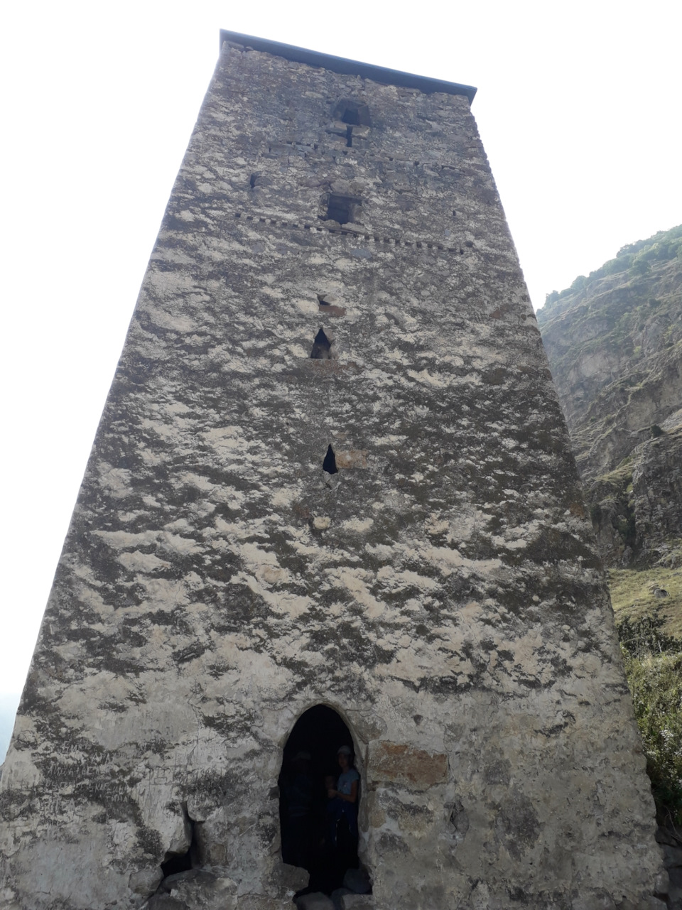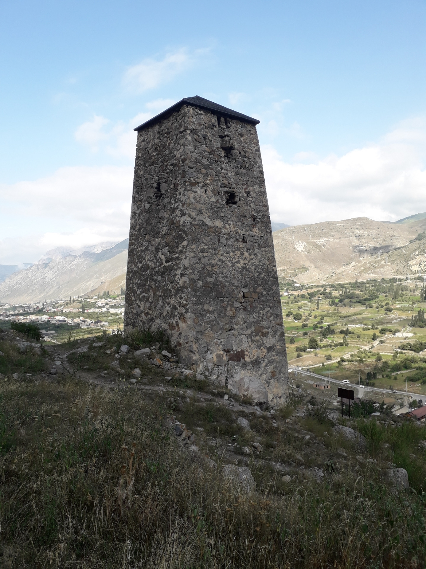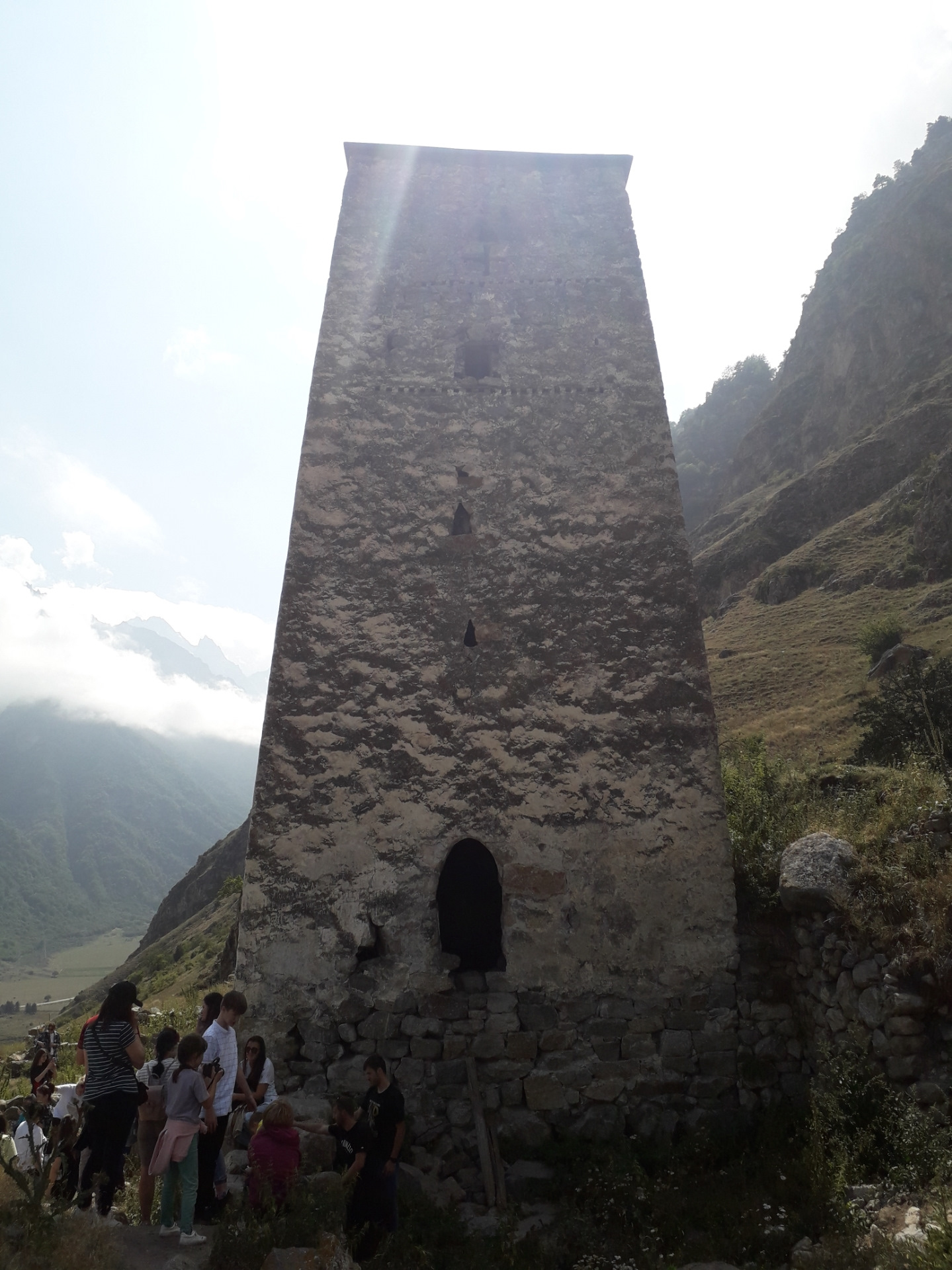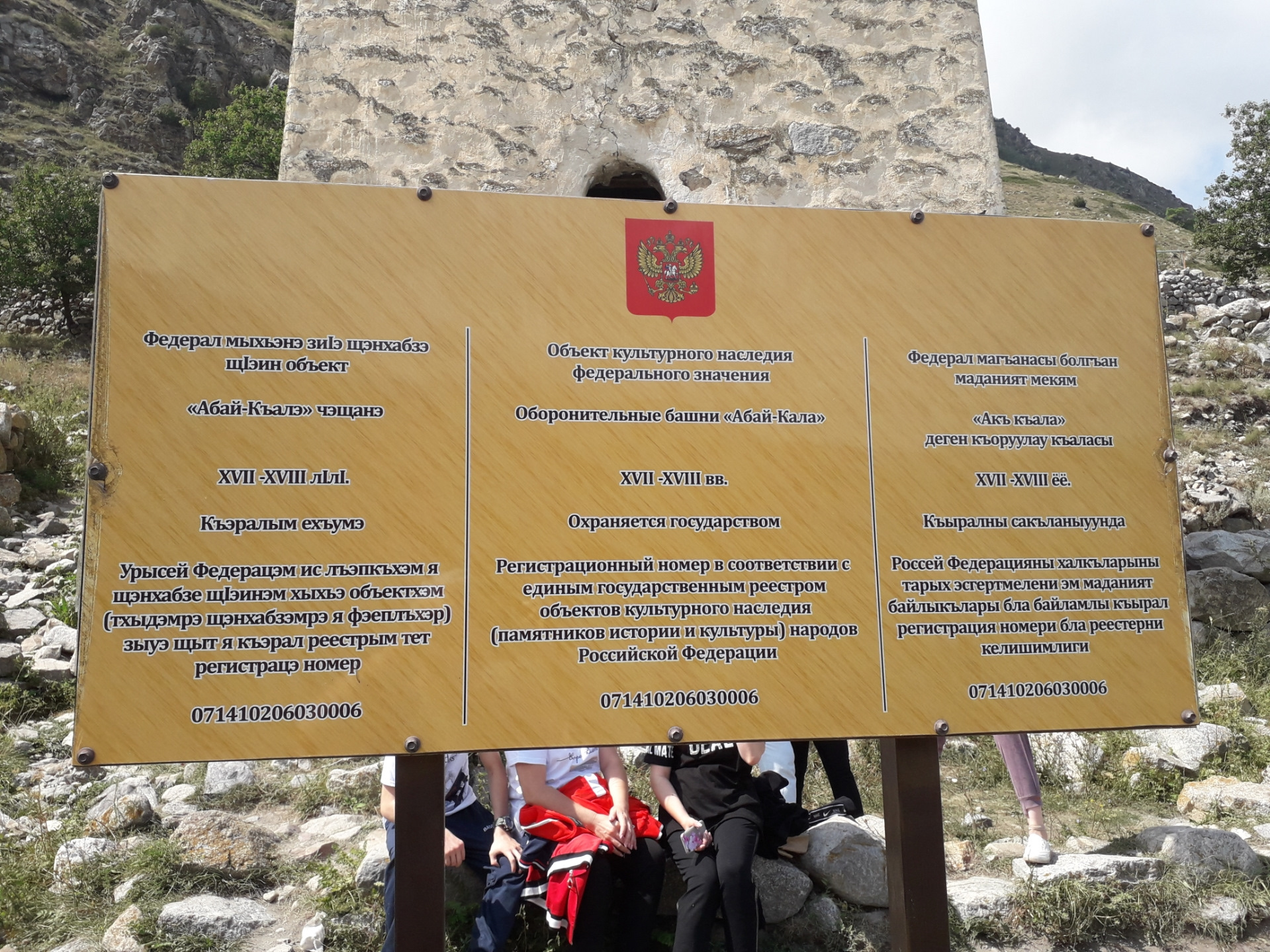 Табличка возле башни на трёх языках — русском, кабардинском и балкарском