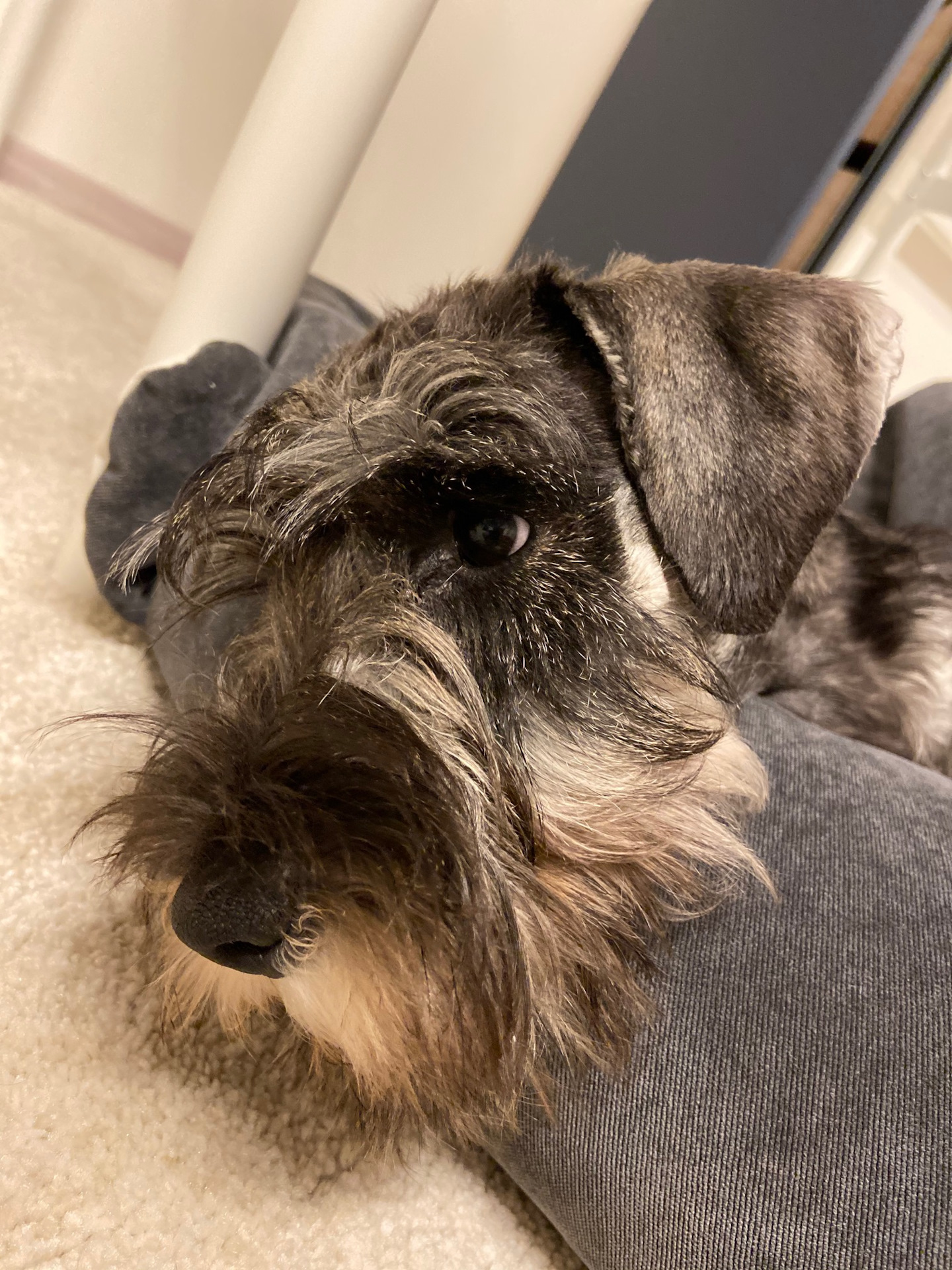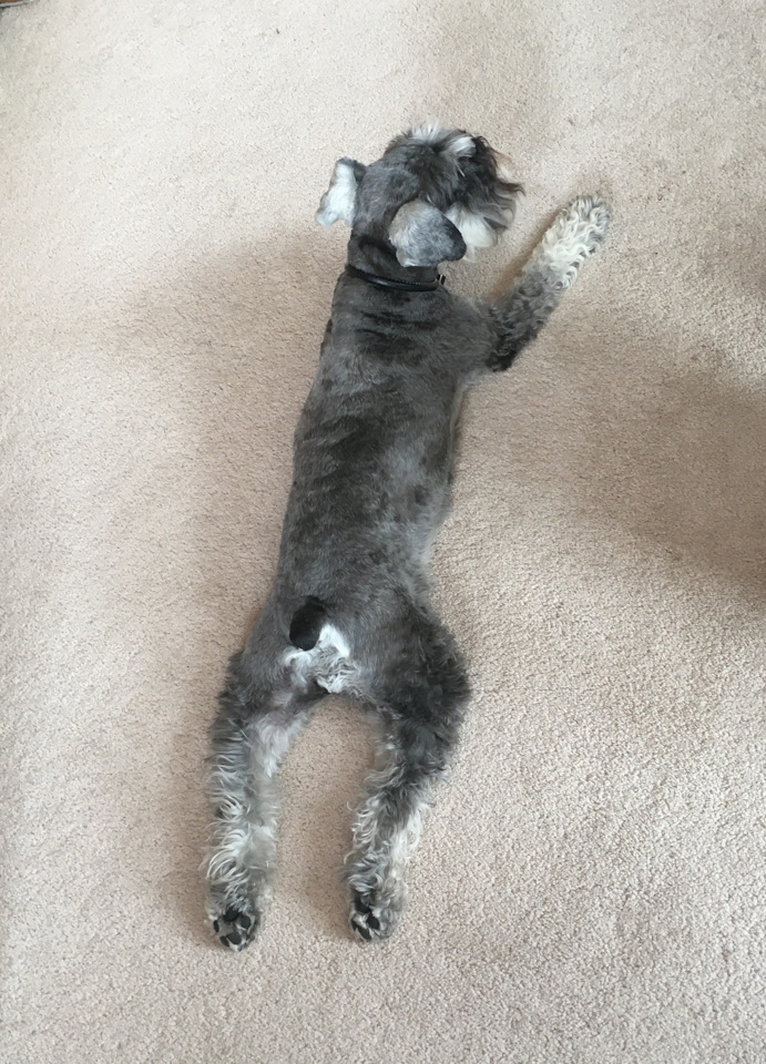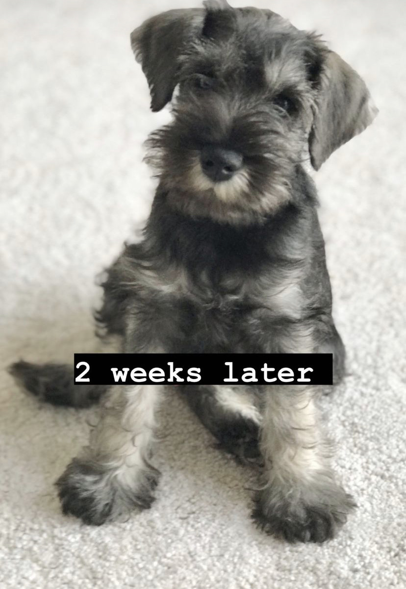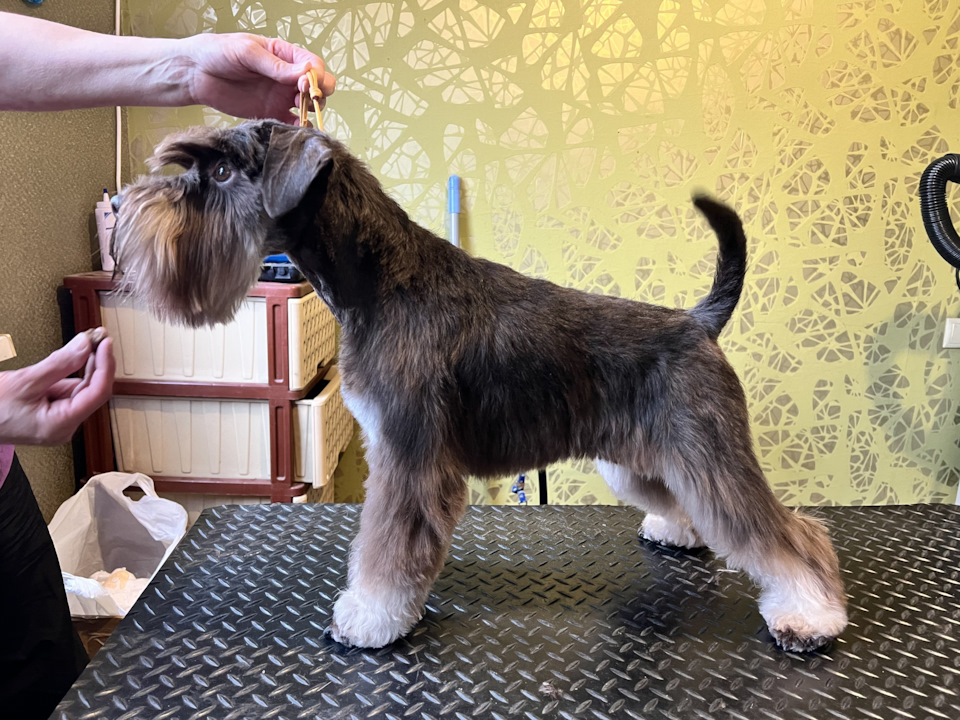 Специфика шерсти щнауцеров требует тримминг (спина/бока): пока собака молодая, шерсть отрастает быстро, но с возрастом процесс замедляется и частота процедур сводится примерно к 3-м за год. Если стричь, то меняется структура остевого волоса, "жёстики" становвтся "мягкими" и тёмный окрас, начинает становиться бурым. Борода, это отдельная история …