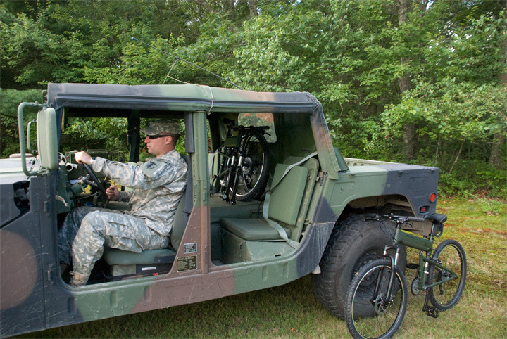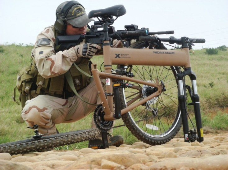 Есть такая американская компания, Montague, что делает в рамках гособоронзаказа (изначально США, а затем и Швейцарии с Великобританией) для десанта и пехоты складные полноразмерные MTB (Mountain Bike) велосипеды. Аппараты не убиваемые, в принципе. Называются они так же дерзко — Paratrooper.
