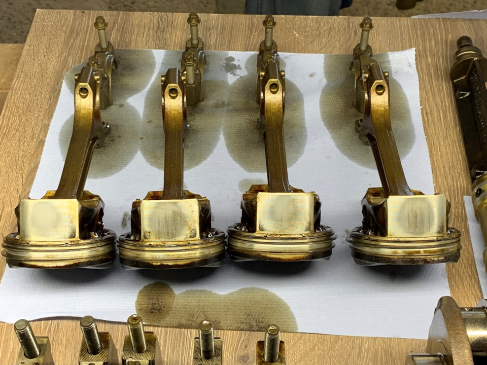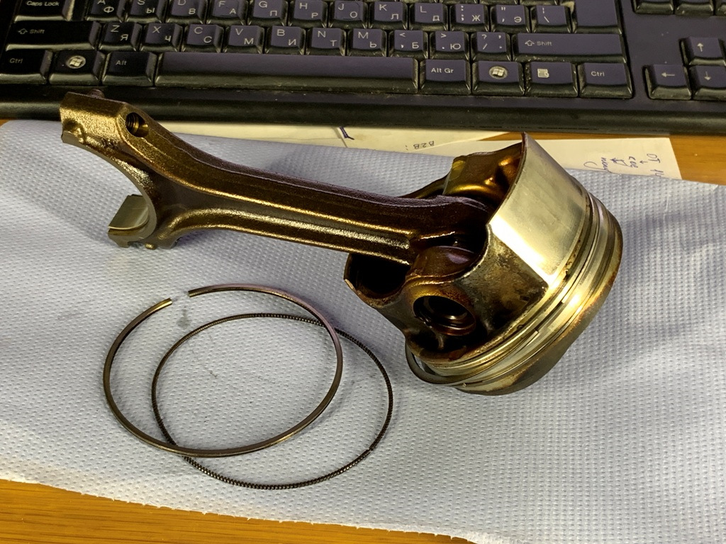 После демонтажа из блока, с поршнями и кольцами я ничего не делал, не чистил, не мыл, не ковырял. Поршни на фото — как есть после разборки двигателя.