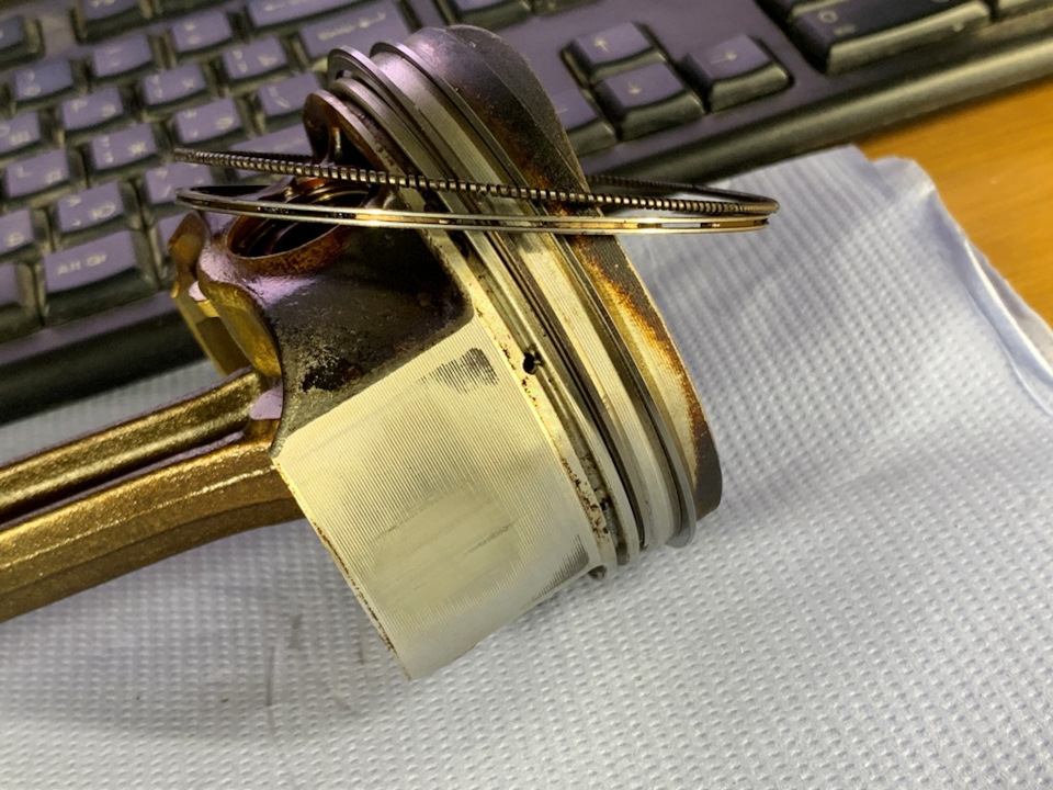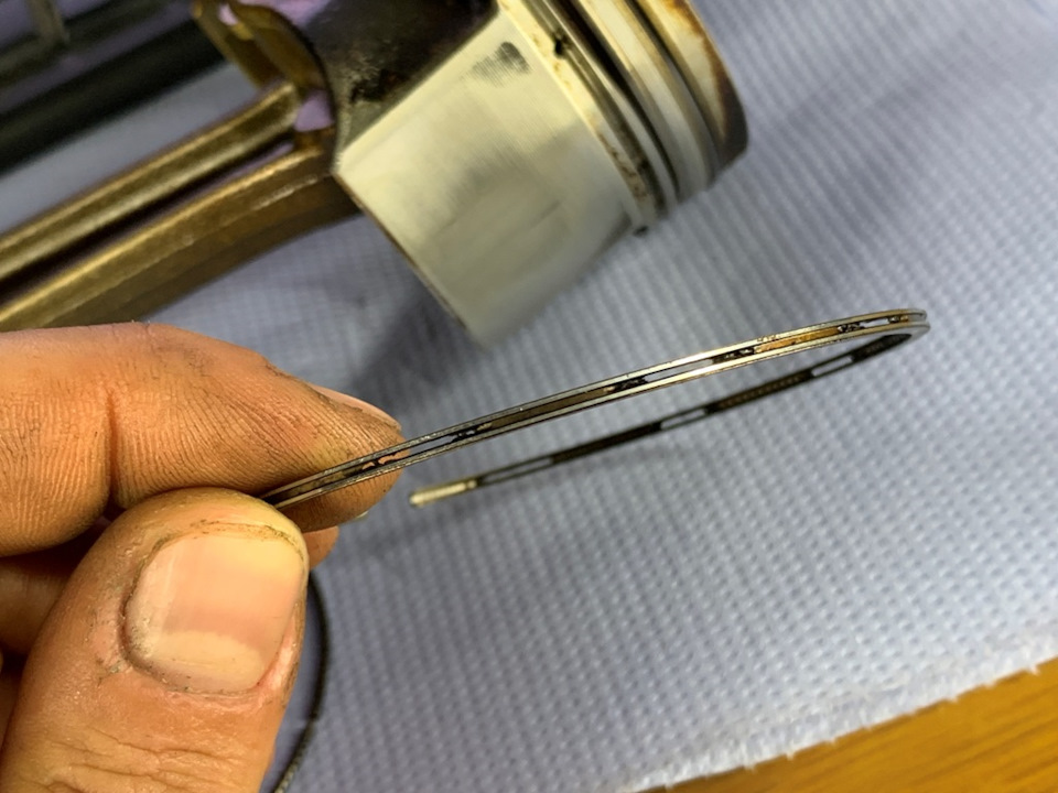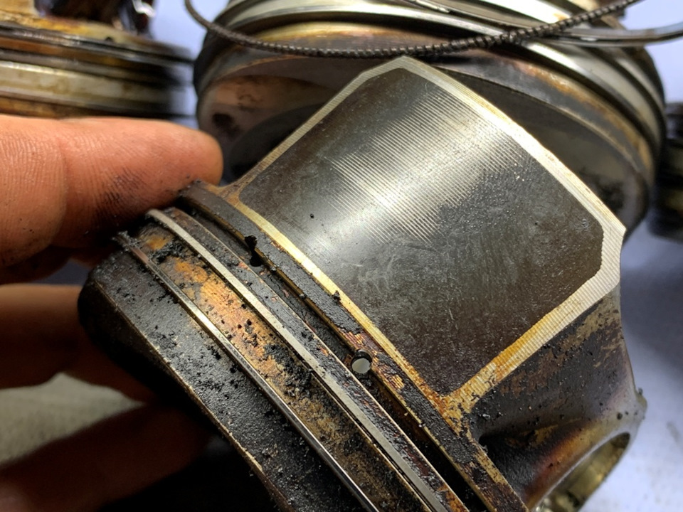 Да ничего, кроме естественного износа юбок поршней и реально отмытых маслосъёмных колец, ничего. Поршни эти изначально оснащены коробчатыми маслосъёмными кольцами с дренажными отверстиями в виде прорезей.