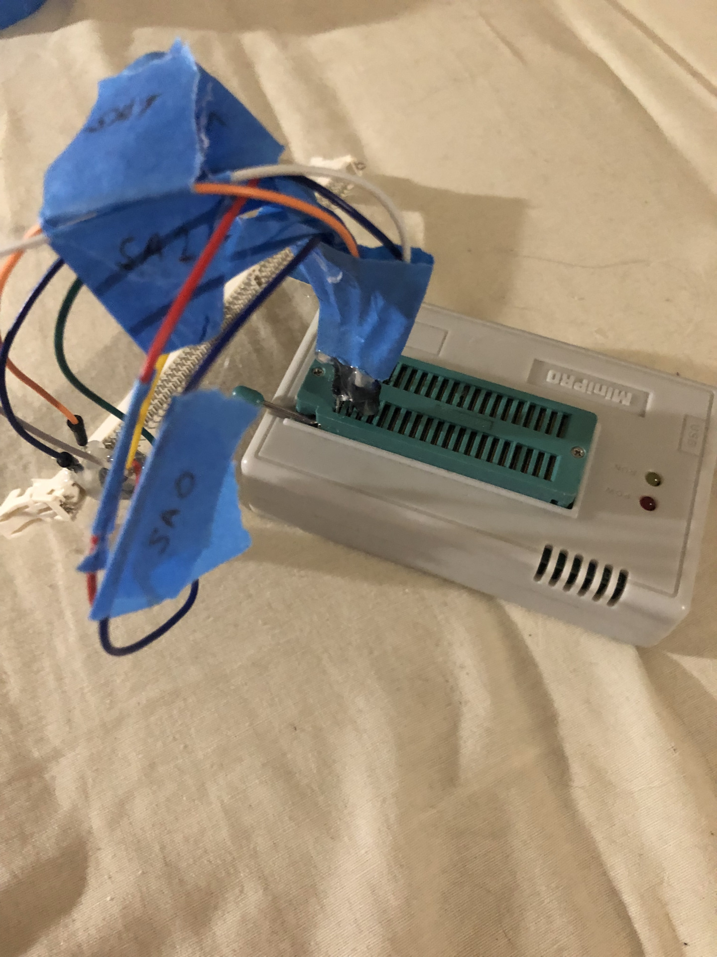 На коленке припаял провода соединительные к выводам купленного разъёма, подключил этого ёжика к программатору…