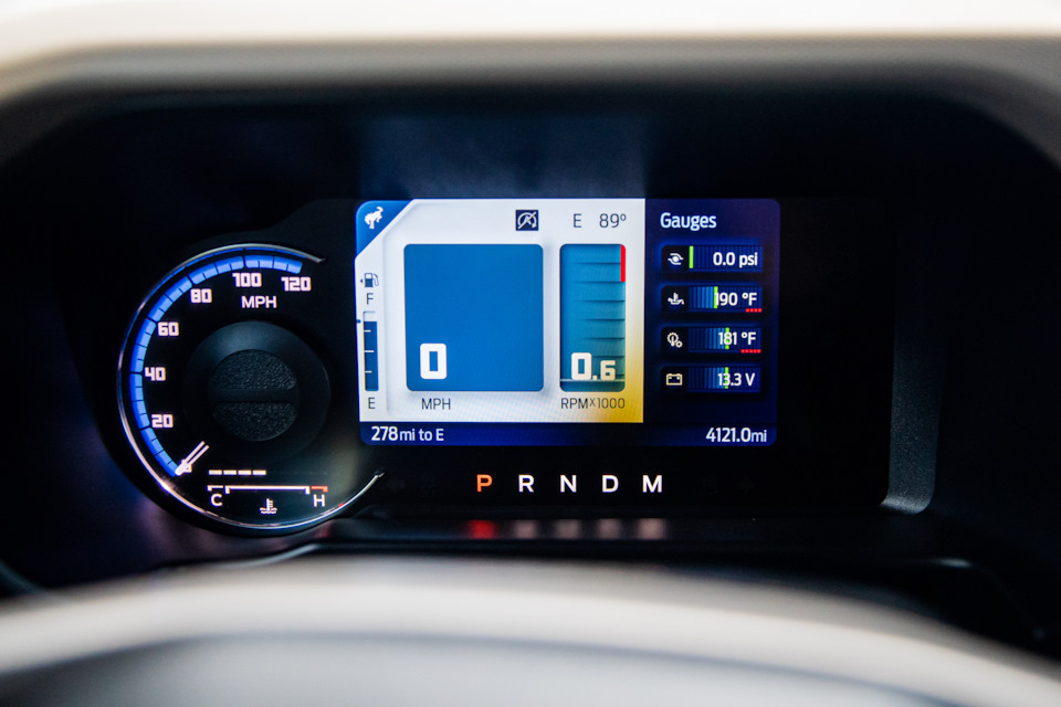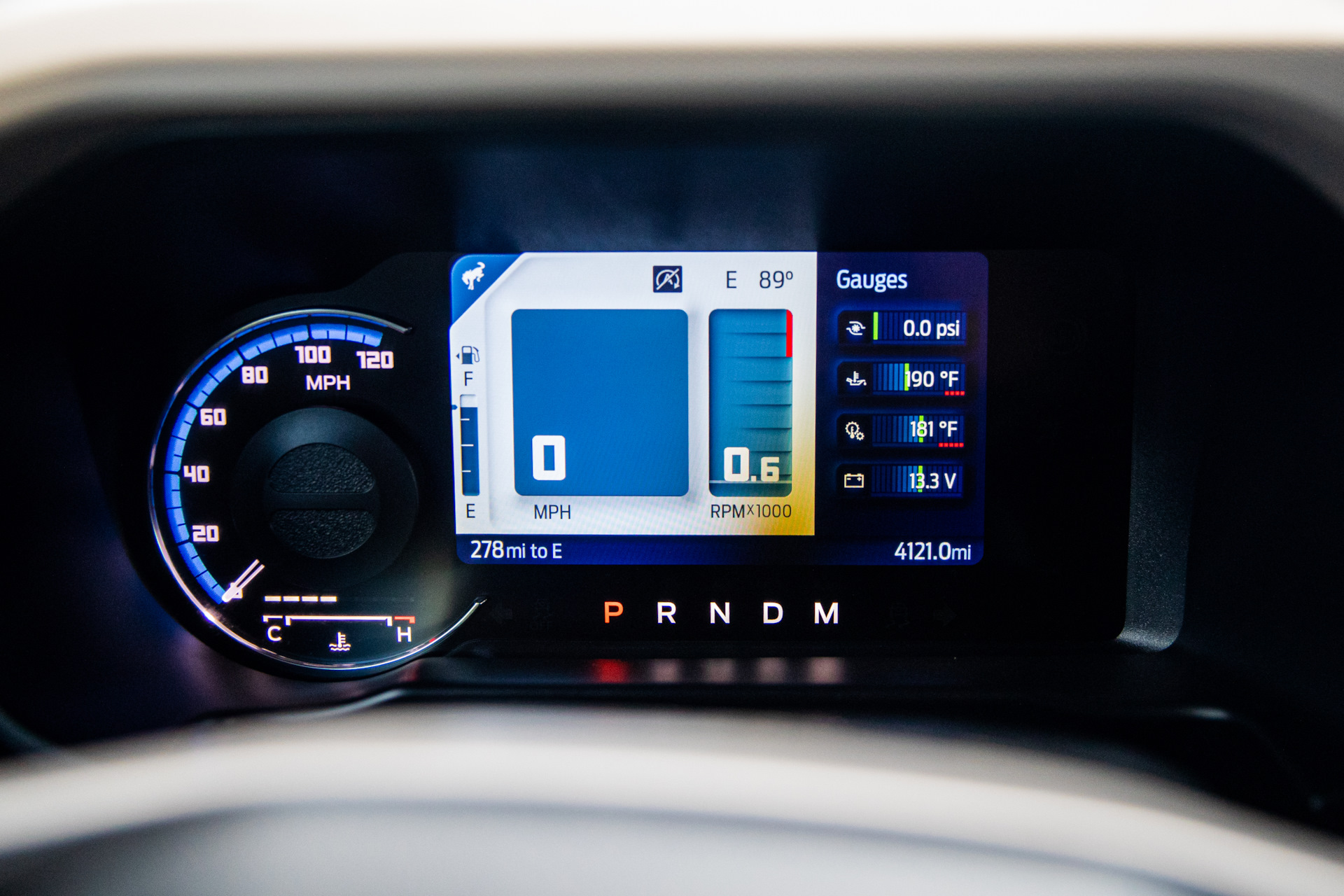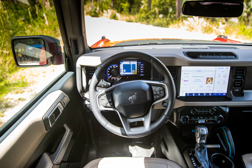 Широкий капот Bronco немного затрудняет обзор вперед. На помощь приходит система кругового обзора, которая позволяет заглянуть на левое или правое колесо, назад и вперед прямо под бампер и, что особенно удобно, увидеть проекцию колеи, таким образом можно точно прицелиться, а это сильно упрощает навигацию, особенно при движении вверх, когда в лобовое стекло мало что видно. На приборную панель можно вывести информацию об угле поворота колес, ориентации по сторонам света, угол крена, распределение момента по осям и многое другое.