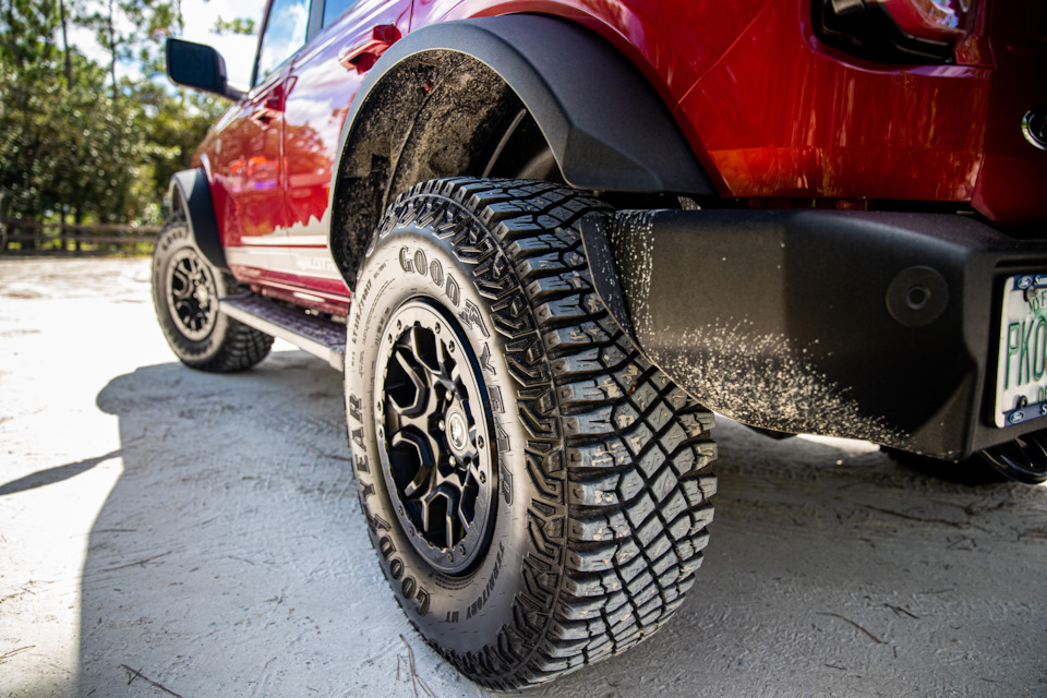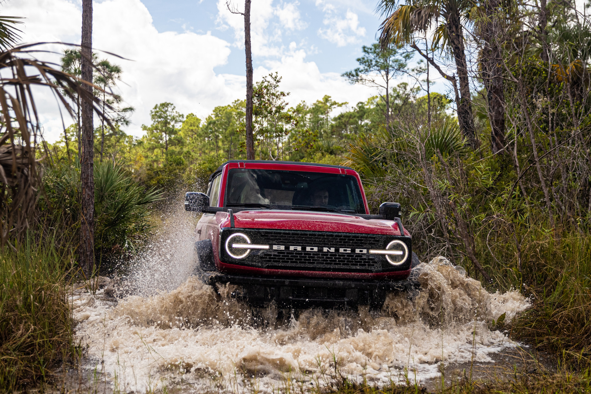Дорожный просвет Bronco варьируется от 211 мм. у базовой версии с обычными колесами до до 295 миллиметров у пакета Sasquatch. Максимальный угол въезда — 29 градусов, съезда — 37,2 градуса, а ходы подвески — 200/215 миллиметров для базовой версии и 240/261 для исполнения Badlands. Глубина брода — 851 миллиметр, что больше, чем у Wrangler (762 мм.), но меньше, чем у Defender с пневмоподвеской.
