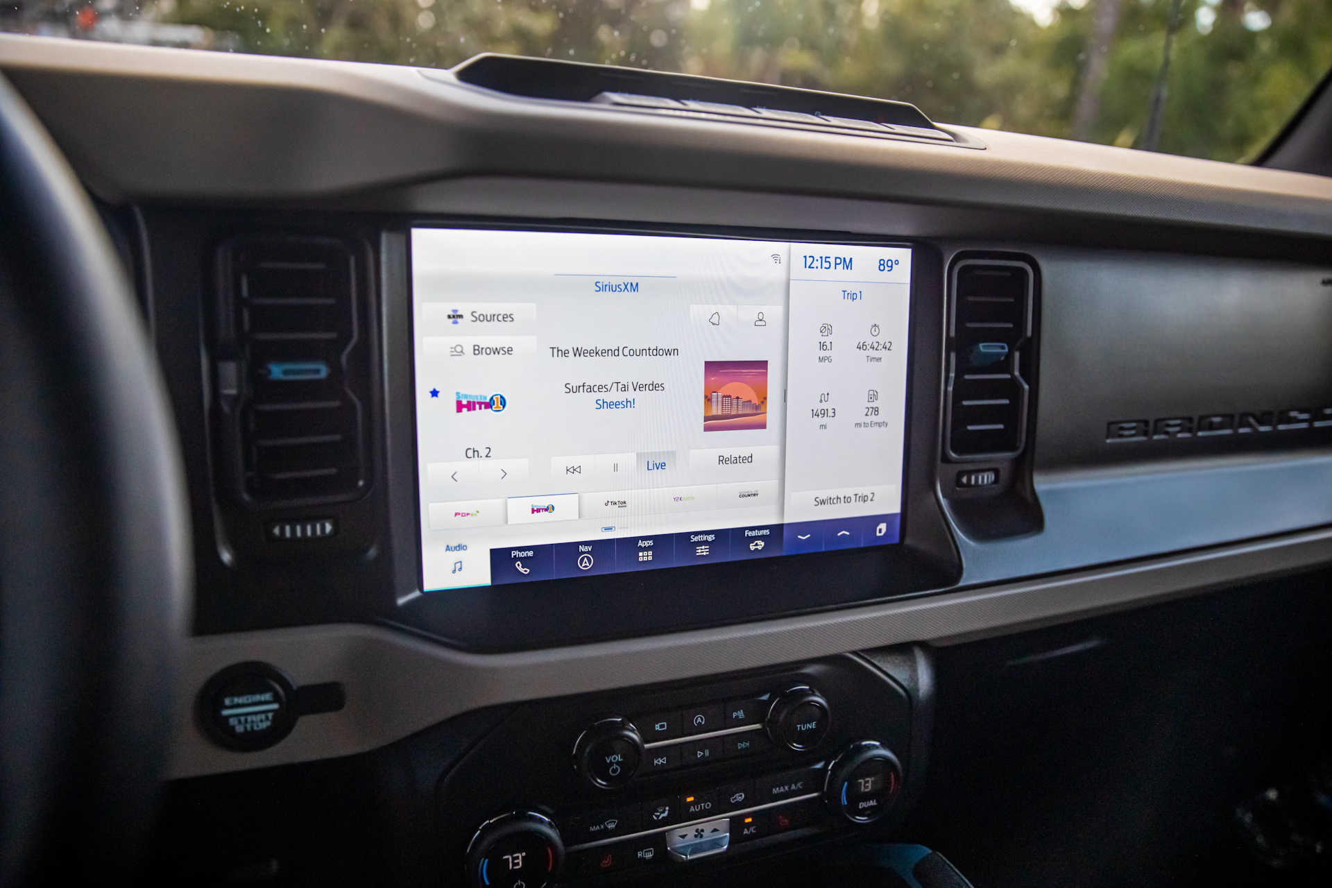 По центру торпедо расположился опциональный 12-дюймовый экран мультимедиа системы, который является украшением автомобиля и сразу делает его более современным. Четвертое поколение фордовской системы SYNC приятно удивило интуитивно-понятным интерфейсом, быстротой откликов и современным дизайном, который не уступает лидерам рынка не только автомобильных систем, но и смартфонам. Возможно совмещение разных вкладок на одном экране. Система регулярно обновляется «по воздуху» и поддерживает приложения FordPass Performance с внедорожной навигацией, через которую открывается доступ к топографическим картам и более тысячи внедорожных маршрутов.