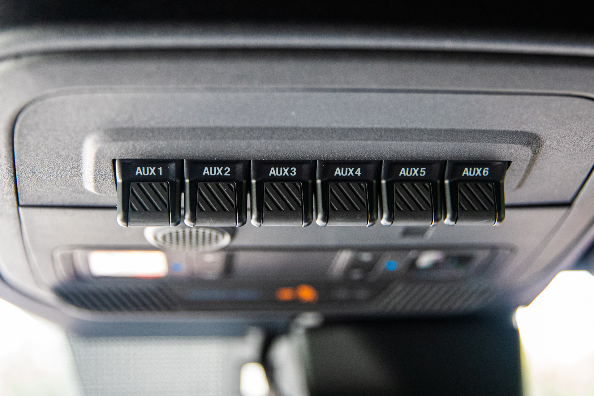 Блок управления внешними аксессуарами доступен в качестве опции и позволяет управлять внешними аксессуарами, вроде люстры на крыши, дополнительного света спереди, холодильников и видеорегистраторов. Тумблеров с подсветкой размещены на потолке, выведены на блок предохранителей и что важнее всего оборудованы собственной проводкой с концами в разных местах: передняя часть автомобиля, передний край крыши, перчаточный ящик и в заднюю часть багажника. Над торпедо можно поставить планку крепление гаджетов от смартфона до GoPro, а питание для них совсем рядом — около лобового стекла.