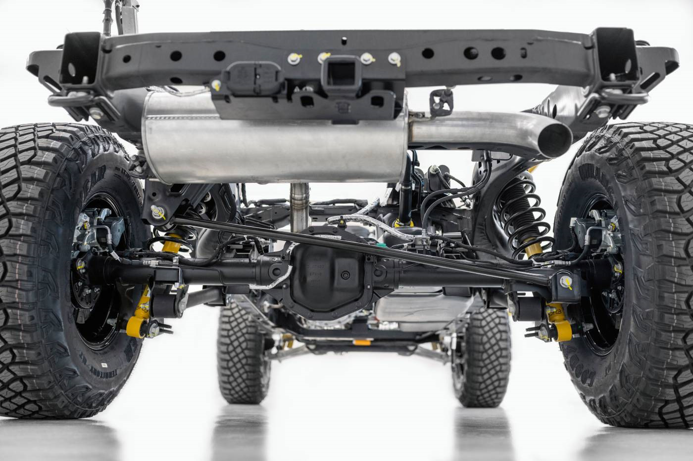 Wranger до сих пор стоит на двух неразрезных мостах, а у Bronco спереди — независимая подвеска Dana AdvanTEK с двойными алюминиевыми А-образными рычагами и стойками типа coil-over, а сзади неразрезной мост Dana 44 AdvanTEK на пружинах с креплением на пяти рычагах.