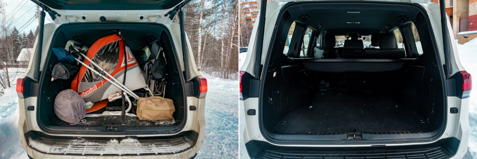 Сиденья не регулируются по горизонтали — только наклон спинки. Сложить их можно по частям — сначала спинку, потом откинуть сложенное кресло к передним сиденьям. Ни в том, ни в другом случае, как и прежде, не образуется нормальное спальное место. Для комфортной ночёвки в LC300 нужно обустраивать "подиум".