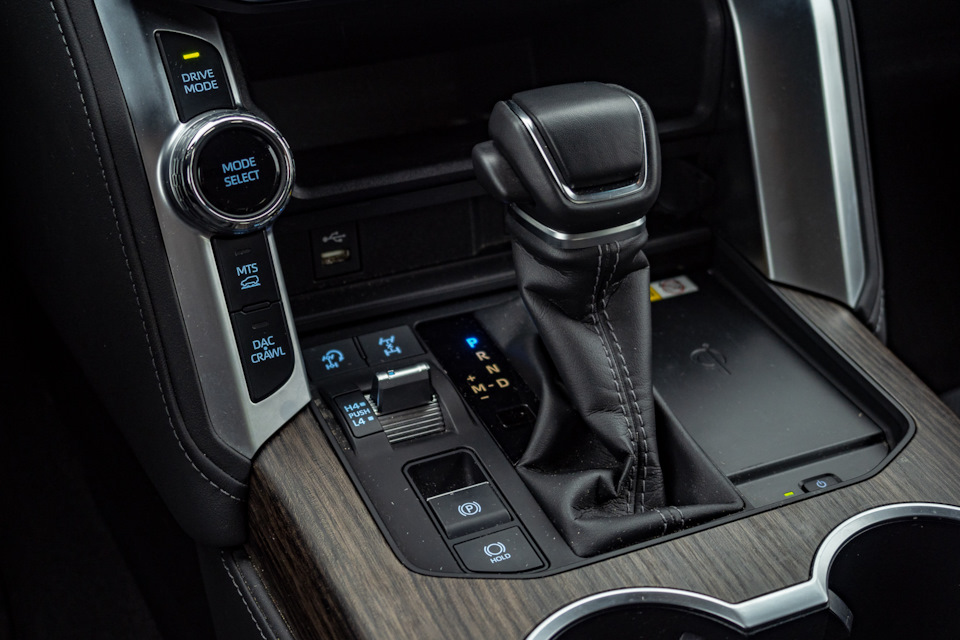 Раздатка управляется тумблером, рядом с которым — клавиши “танкового разворота” и центральной блокировки. Кнопки межколесных блокировок — в слепой зоне центральной панели. Не очень удобно, в Toyota решили не делать две разных версии накладки тоннеля, или не оставлять заглушки на видном месте в “топовой” модификации.