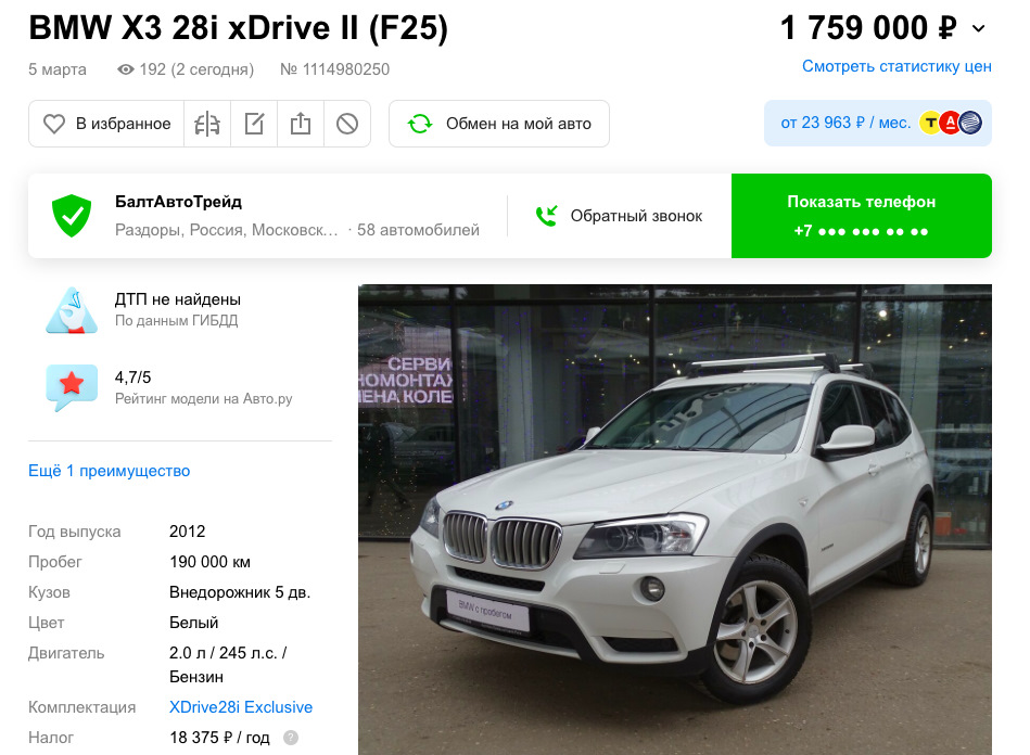 BMW X3, выпущенный в 2012 году, с 2-литровым бензиновым мотором, полным приводом и "автоматом" предлагается за 1.759.000 рублей, или 17.590$ (курс в обменниках) и 14.658$ (курс ЦБ). У нас можно найти от 16.000$.