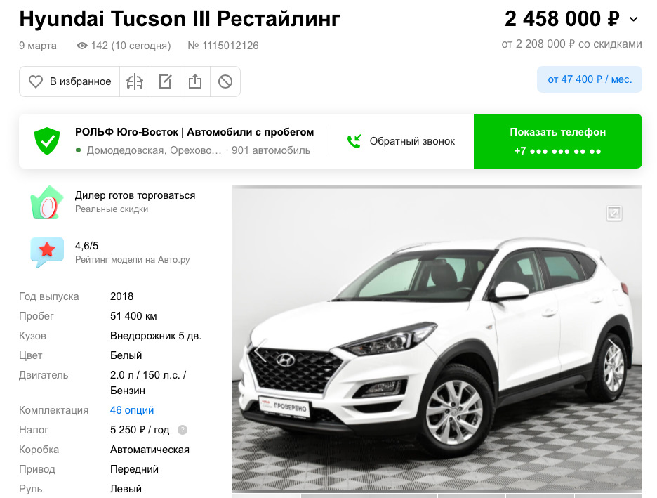 Рестайлинговый Hyundai Tucson 2018 г.в. с 2-литровым бензиновым мотором и "автоматом" продается за 2.458.000 рублей. Это 24.580$, если поменять по курсу 100 руб. за доллар или 20.483$, если менять по 120 руб. за доллар. У нас такие машины стоят 22.000-24.000$.