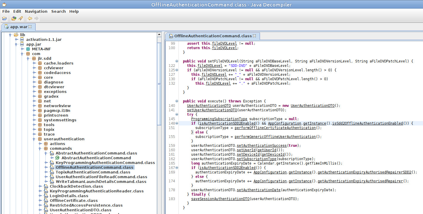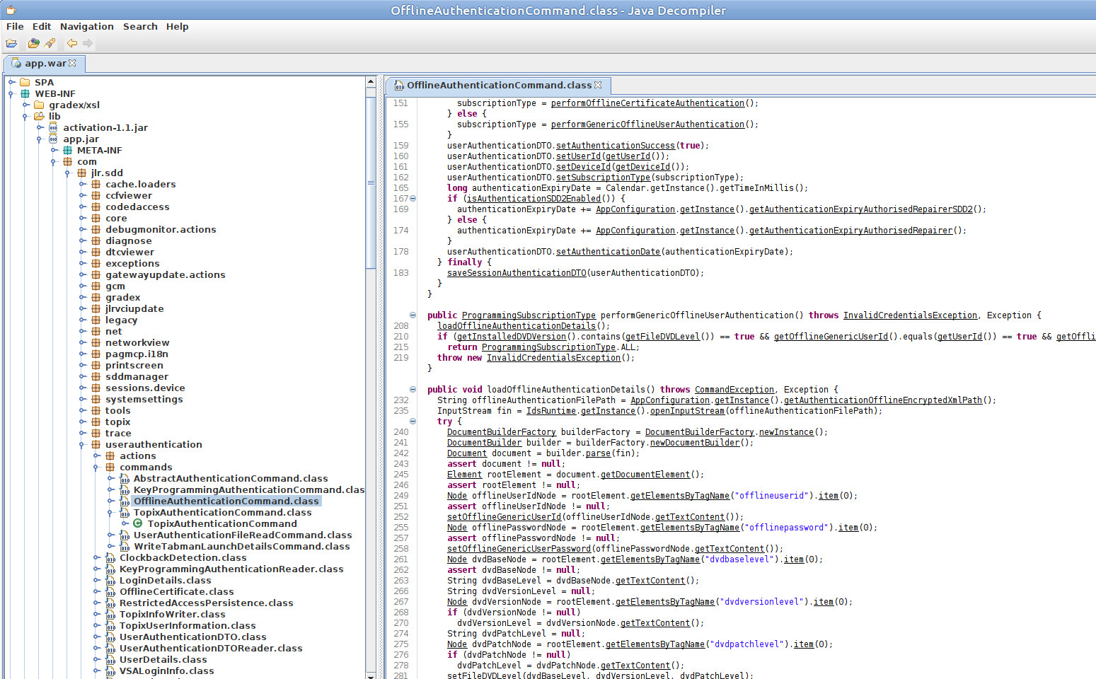 Аутентификация пользователя с помощью файла offid.exml осуществляется проверкой на соответсвие введенных логина и пароля и данным записанных в локальном файле C:\Program Files\JLR\SDD\Runtime\offid.exml. Для успешной аутентификации введенные в форме программы логин и пароль должны совпадать с данными, хранящимися в файле offid.exml, а также должна совпадать версии программы SDD, эти проверки осуществляются в функции performGenericOfflineUserAuthentication в тоже классе OfflineAuthenticationCommand,