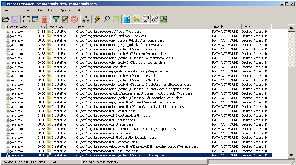 Поэтому чтобы найти возможные пути решения без правки app.war я запустил монитор процессов совместно с SDD, чтобы выяснить какие файлы SDD загружает в процессе своей работы. Увидев то что представлено на следующем скриншоте я был сильно удивлен, т.к. начиная с какого то момента времени SDD пробует загружать все классы и ресурсы содержащиеся в app.war с диска C. На скриншоте видны попытки загрузки и упомянутого выше файла OfflineAuthenticator.class и публичного ключа publickey.bin.