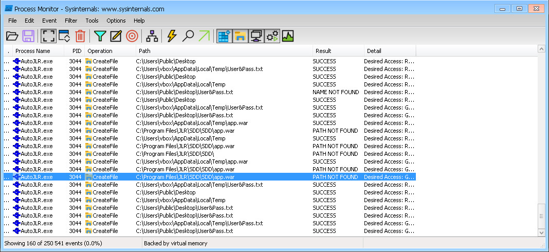 Далее запуская по очереди активаторы совместно с монитором процессов, который позволяет отслеживать все действия программ в процессе своей работы, можно узнать что же делает активатор. В окне монитора процессов, для удобства можно настроить фильтр, чтобы отображались события только от активатора и тогда можно увидеть, что в процессе работы активаторов создается файл app.war, в каталоге C:\Program Files\JLR\SDD\SDD.