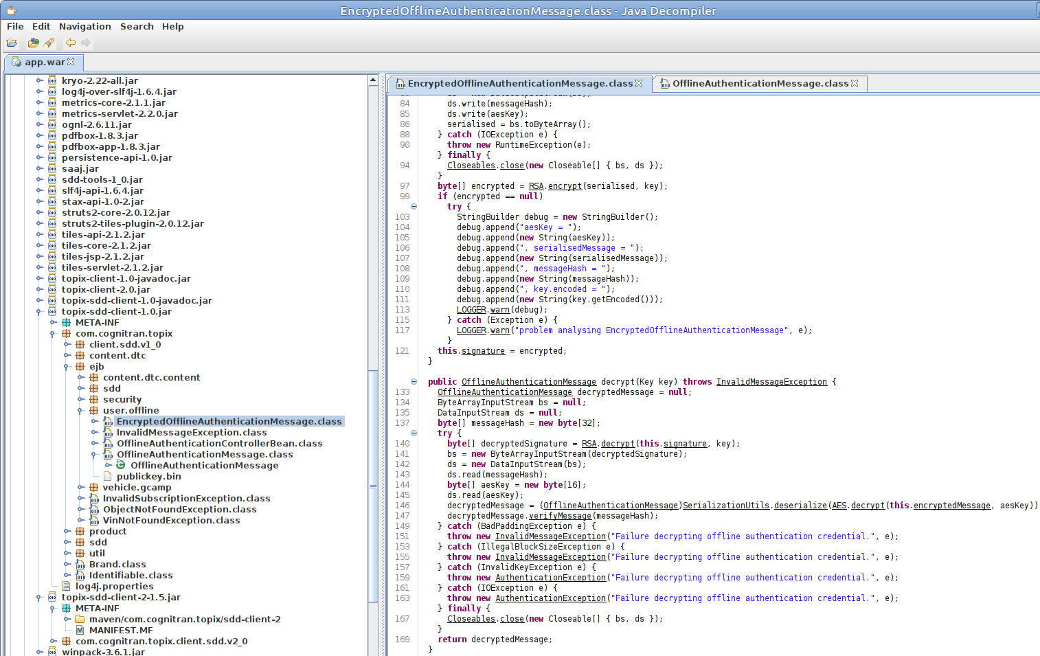 Файл app.war, это обычный архив с java классами, war — это сокращение от Web Archive, его можно открыть в любой программе-распаковщике архивов, даже в встроенном в windows zip-распаковщике. Файлы Java-классов предназначены для непосредственного исполнения компьютером в среде JAVA и не пригодны для анализа человеком. Для преобразования java классов в читаемое представление понадобится декомпилятор java, декомпилятор позволяет преобразовать все java классы из war файла в текстовые файлы, которые можно сохранить отдельно для каждого app.war. Полученные в результате декомпиляции текстовые файлы от различных активаторов можно сравнить между собой в программах для сравнения файлов, например winmerge.