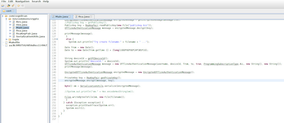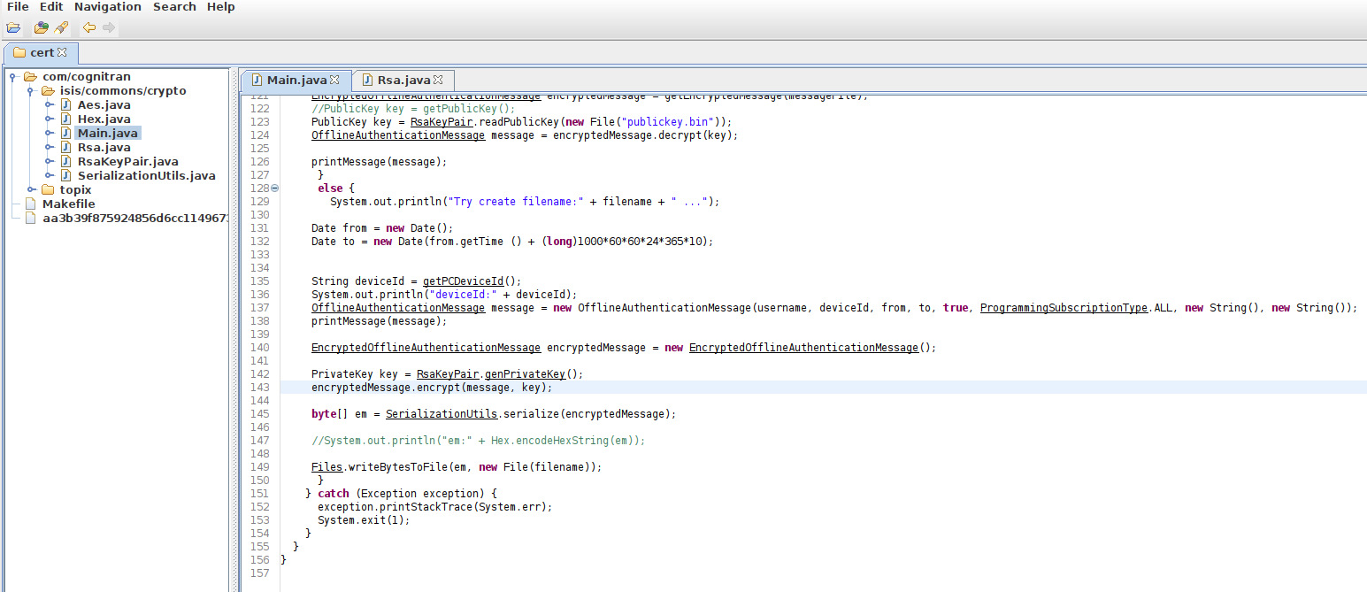 Но и это решение не идеальное, т.к. при новом обновлении SDD потенциально возможны изменения в классе OfflineAuthenticator.class из состава SDD, которых нет в локальном классе OfflineAuthenticator.class. Поэтому лучшим решением будет создание оффлайн сертификатов с помощью своей пары ключей с сохранением публичного ключа как c:\com\cognitran\topix\client\sdd\v3_0\security\publickey.bin. При таком решении модификации никаких классов не производится, при аутентификации пользователя SDD самостоятельно будет загружать локальный файл publickey.bin и проверять сертификат, если сертификат создан с помощью частного ключа из той же пары что и publickey.bin, то в результате будет действующая подписка.