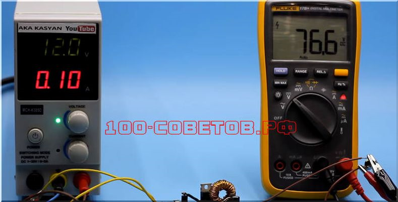 что амплитудное значение выходного напряжения при питания от источника 12 вольт доходит до 70-75 вольт и зависит исключительно от индуктивности накопительного дросселя.