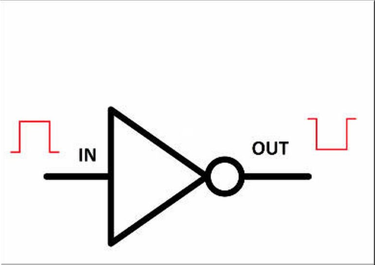 каждый инвертор имеет один вход и один выход, их задача «отрицание». Если на вход поступает высокий уровень, на выходе получаем обратное, иначе говоря инвертированный или перевёрнутый сигнал.