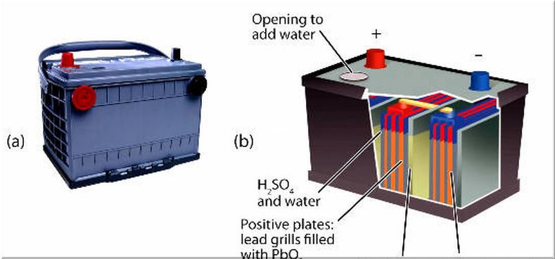 Автомобильный аккумулятор состоит из свинцовых пластин находящихся в растворе электролита, в данном случае электролитом является серная кислота.