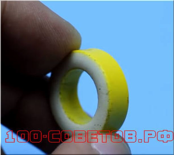 намотан на кольце из порошкового железа, такие кольца можно найти в компьютерных БП, размеры кольца внешний диаметр-20.5мм, внутренний 12мм и ширина кольца 6.6мм.