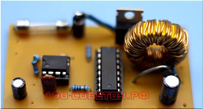 На микросхеме NE555 собран генератор прямоугольных импульсов, частота этих импульсов около 1 килогерц, коэффициент заполнения 90%, то есть сигнал высокого уровня длится большУю часть времени, именно этот импульс нам нужен для того, чтобы открыть полевой транзистор.