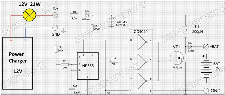 Схема изначально создана для зарядки аккумуляторов малой ёмкости, но её успешно используют и для десульфатации автомобильных аккумуляторов.