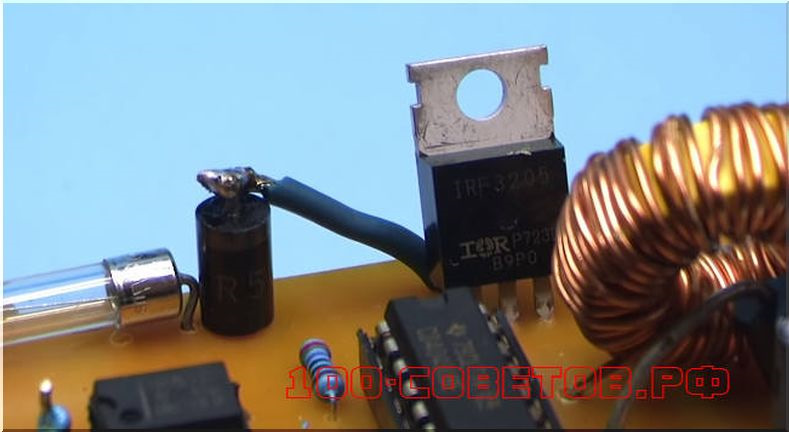 Полевой транзистор IRF3205 или любые другие n-канальные с напряжением от 60 до 200 вольт и с током от 30 ампер.