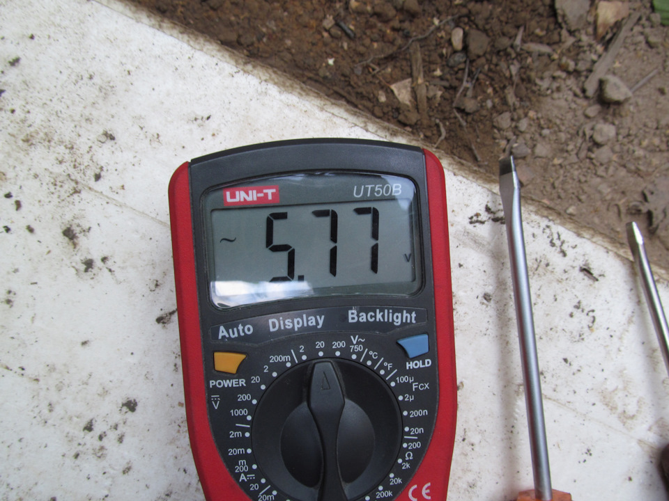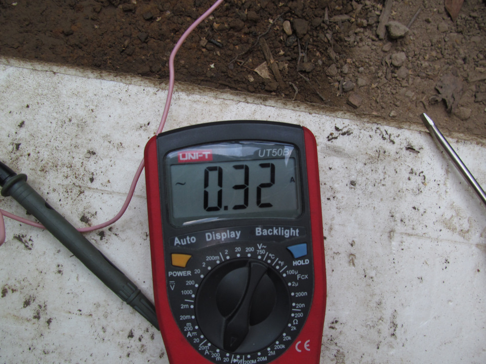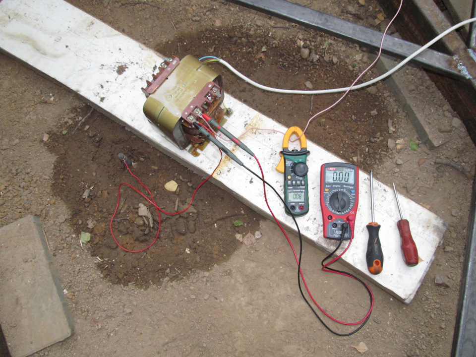 Поехали дальше. Забить то забили, но как оценить качество получившегося заземления? Нужно мерять сопротивление растеканию. Особо страждущих отправлю читать ПУЭ и спецлитературу, но, совсем кратко, на две, вбитые в землю, палки нужно подать разность потенциалов и померять протекающий ток. В профессиональных приборах используется схема с двумя электродами-колышками, вбиваемыми в землю на расстоянии 30 — 50 метров от тестируемого заземления. Элементарные соображения наводят на мысль, что два измерительных электрода позволяют измерить их собственное сопротивление и вычесть его из результатов измерения основного контура. Для метода же двух палок нужно иметь идеальное второе заземление с нулевым сопротивлением, но, за неимением такового, было использовано заземление нашего локального трансформатора, поэтому измереная величина дает оценку сверху, как сумму сопротивлений обоих заземлений, соответственно, реальная цифра будет лучше.
