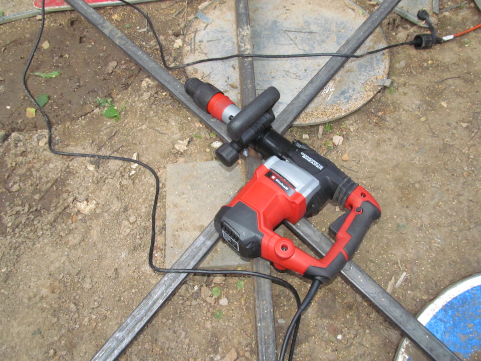 Так же реклама рекомендует, для ускорения и облегчения работы, использовать перфоратор с энергией удара от 20 Джоулей. Бюджет мероприятия удвоился, я метнулся в магазин и купил дешевый (~26000 руб.) бетонолом Einhell TE-DH 1027 с энергией удара 32 Дж и системой крепления инструмента SDS-max. Дешевый он от того, что это чисто отбойный молоток, патрон у него не вращается, но именно такой мне и был нужен. Были и помощнее отбойные молотки, но они уже под инструмент с 30 мм шестигранником и таким весом, что для данной задачи не годятся, хотя по прямому назначению, думаю, очень неплохи.