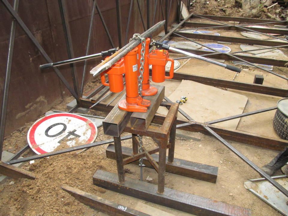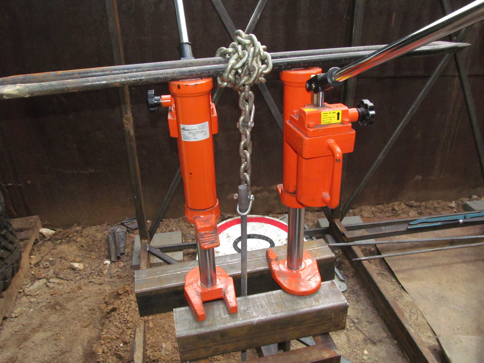 Моднейший и дорогущий гидравличесий джиперский домкрат ничего не смог. Стандартный хайджек тоже. Пришлось сооружать монументальный портал из двух низкоподхватных пятитонных домкратов, 100 мм труб, двух ломов и стальной табуретки. В процессе отладки конструкции порвалась 5 мм цепь, погнулись скобы, с трудом удалось отыскать у маляров цепь от рихтовочного стапеля и да, вот она смогла. Перехватами по 30 см вытащили весь штырь из земли. Это была самая интересная часть нашего Марлезонского балета.