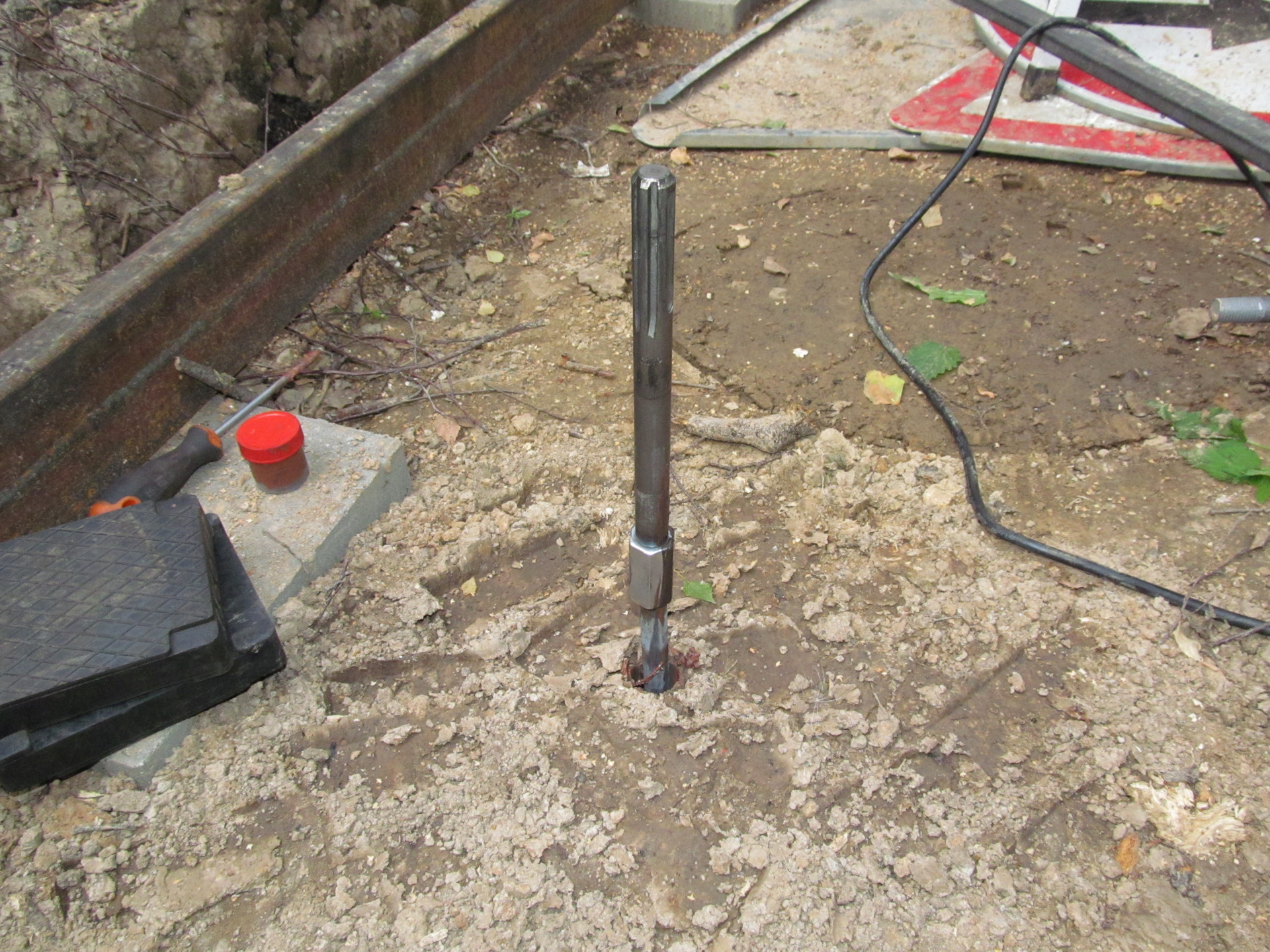 2) Очень важный момент: от вибрации все муфты раскручиваются и можно потерять штырь на глубине Х метров под землей. Поэтому, крайне важно все время держать весь штырь в натяге. При долблении кувалдой, прямо в процессе тянуть верхнюю муфту гаечным ключом, либо, как в моем случае, поддавливать по часовой стрелке перфоратор. Это реально залог успеха. В рекламе про это не упоминается.