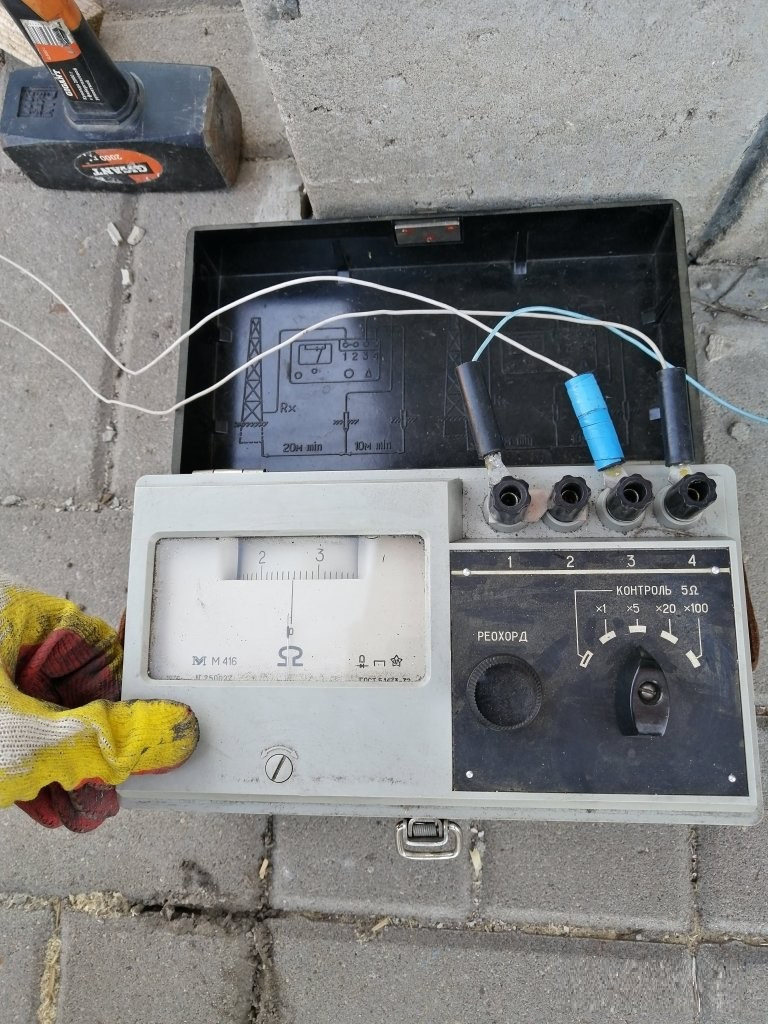 Может из-за грунтовой обсыпки с песком ( потом засыпал отверстие вокруг штыря, проливая водой) будет больше сопротивление, но пока так), измерю, самому интересно.