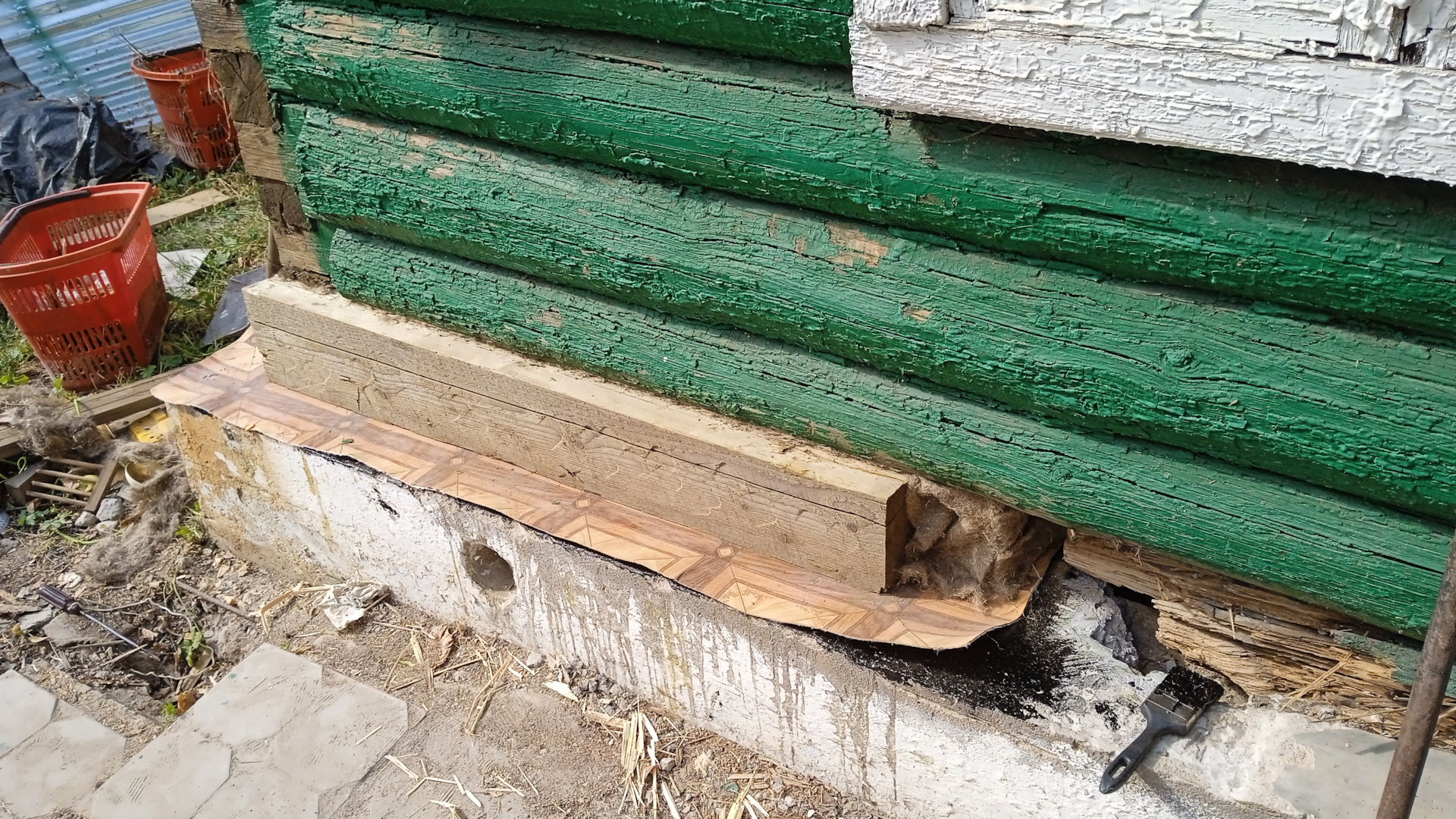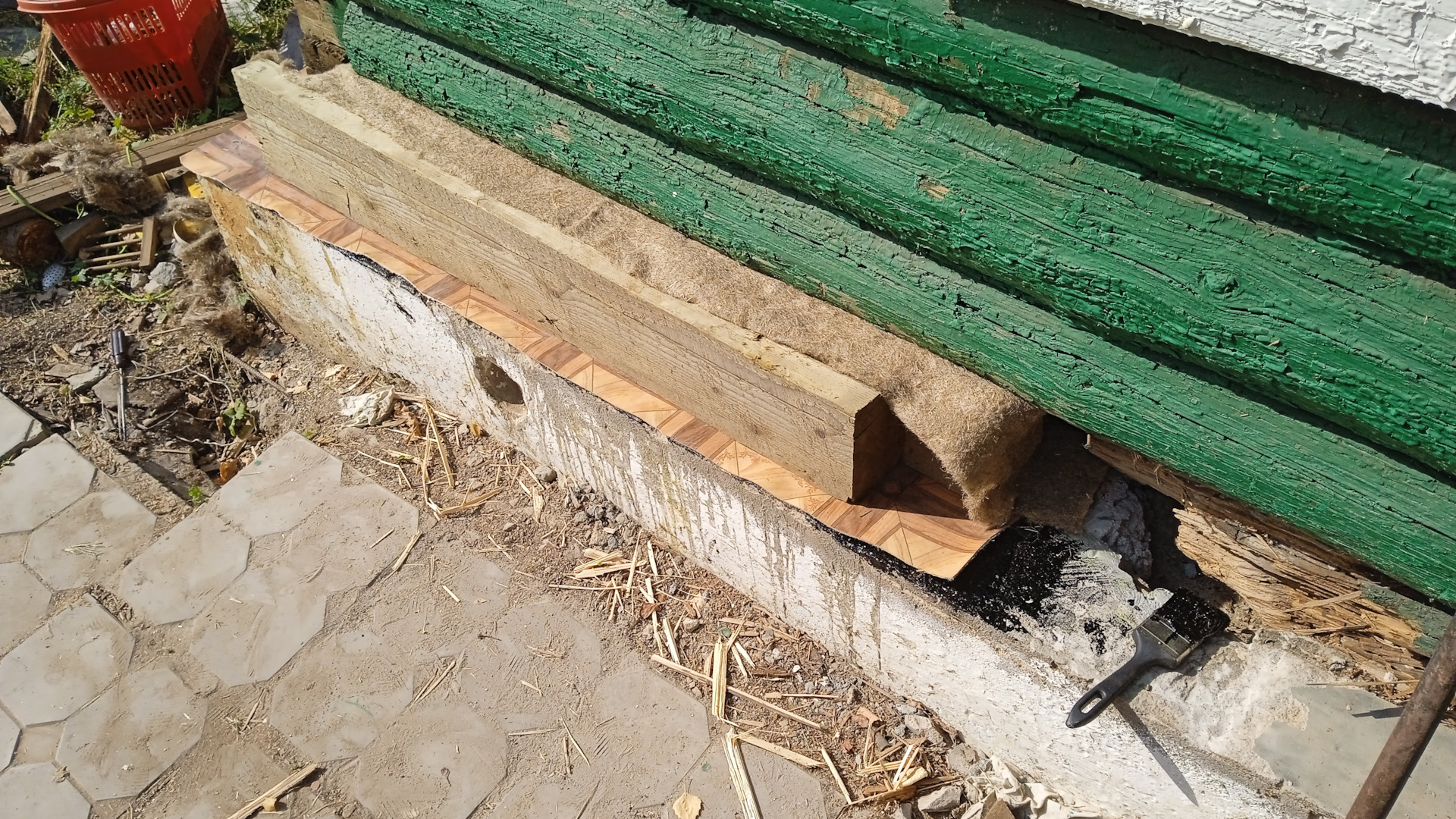 Далее на фундамент нанес битумную мастику и приклеил на нее кусок линолеума. Линолеум гладкий и позволяет забить на место ремонтный брус без особых проблем. Также обработал сам брус и бревна биозащитой в три слоя.