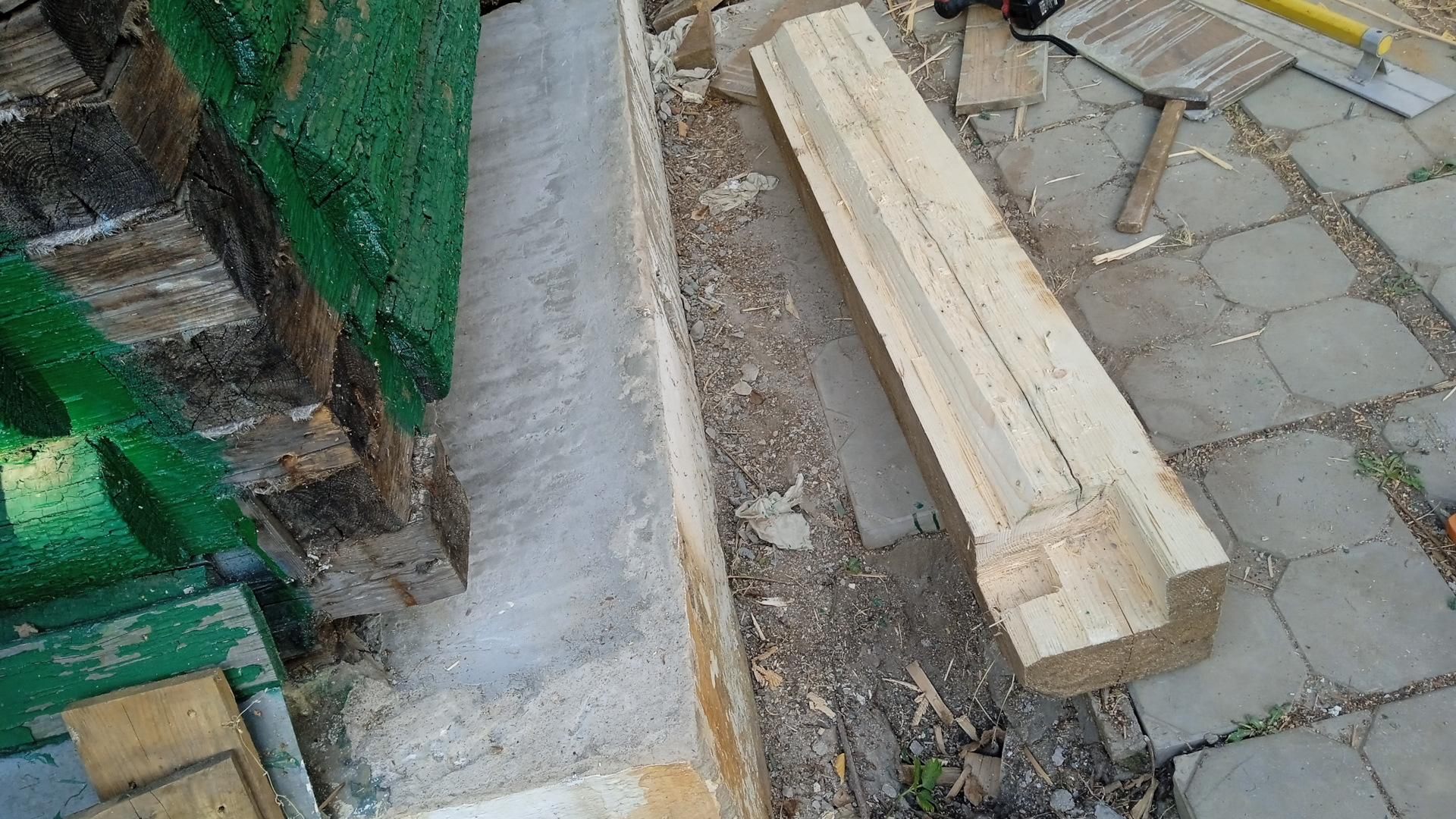 Так как нагрузку это гнилье уже не держало, ничего не домкратил, вес уже давно распределился на другие бревна. Затем сбил перфоратором верхний слой бетона и залил новую ровную площадку. Параллельно вырезал из куска бруса 200x200 мм ремонтную вставку.