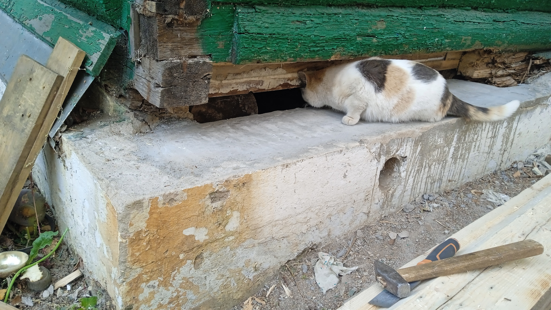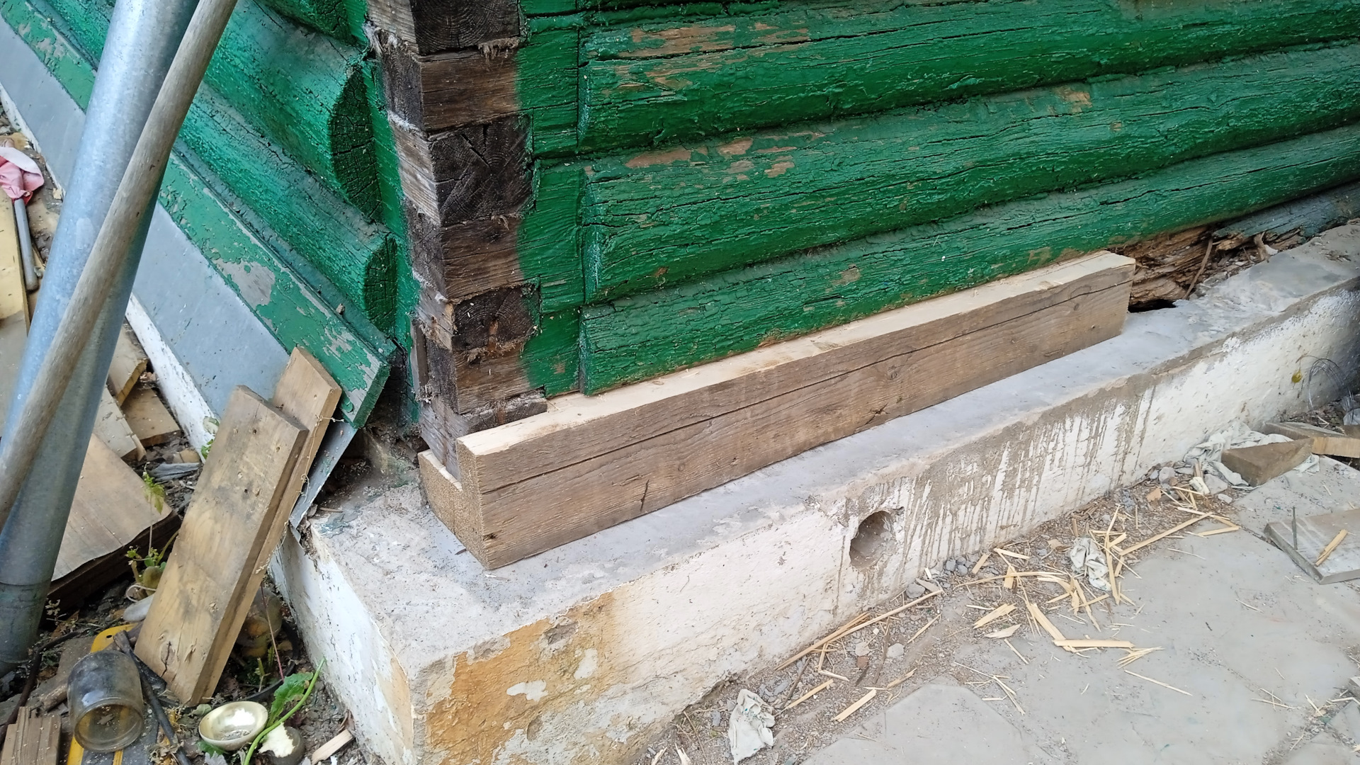 Наконец-то дошли руки до небольшого ремонта дома. Еще в прошлом году обнаружил, что с одной стороны в моей избе почти целиком сгнило бревно. Оно не удивительно, ведь долгое время до меня в ней никто не жил, да и сделано все было так себе. Нижний венец был залит бетоном без гидроизоляции, то есть оказался в своеобразной бетонной ванне, где благополучно сгнил. Ну по хорошему надо бы вывешивать на домкратах сруб и менять целиком, но это задача непростая и недешевая, так что решил что-нибудь изобразить самостоятельно из подручных средств.