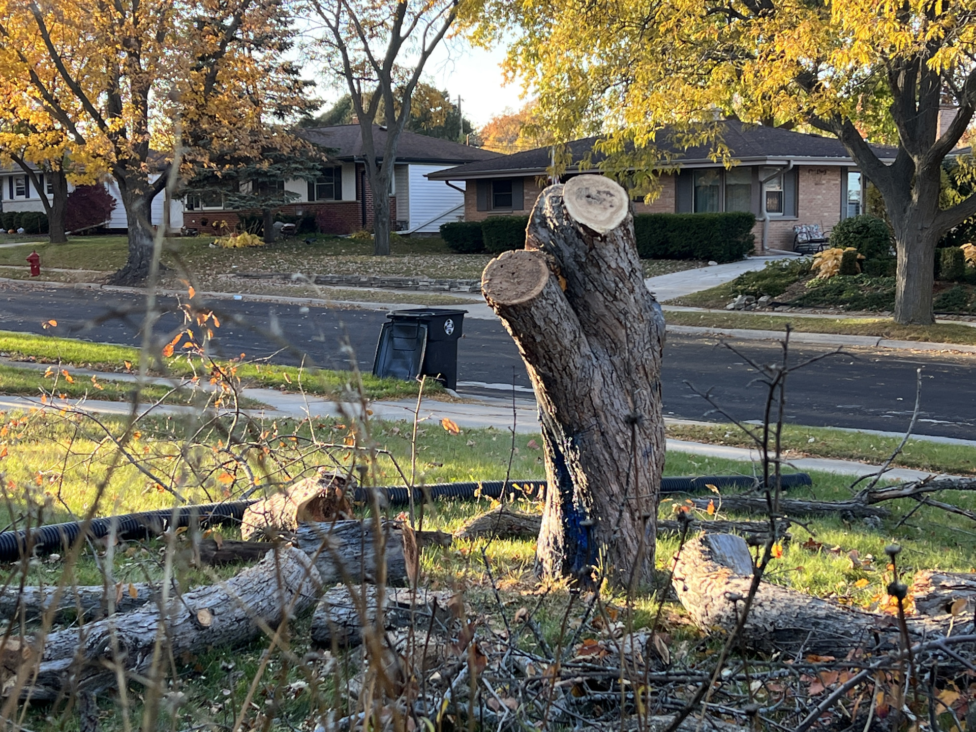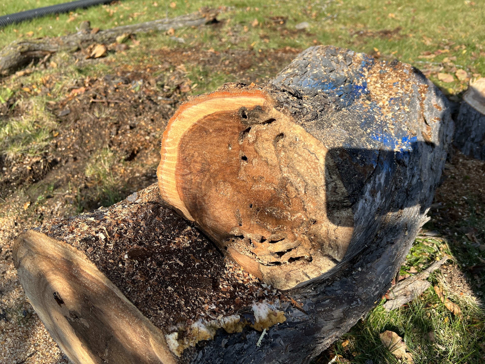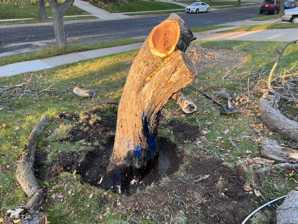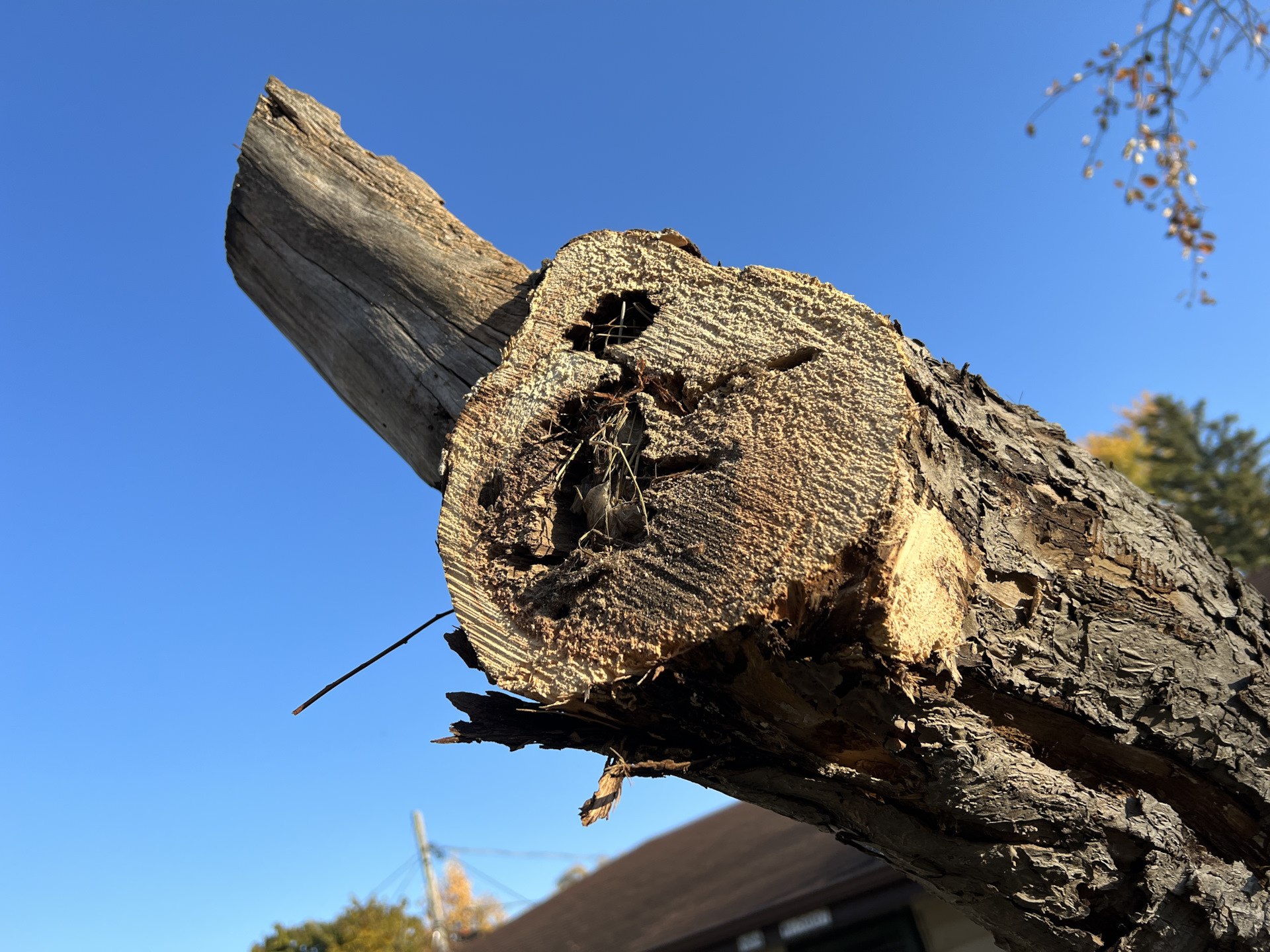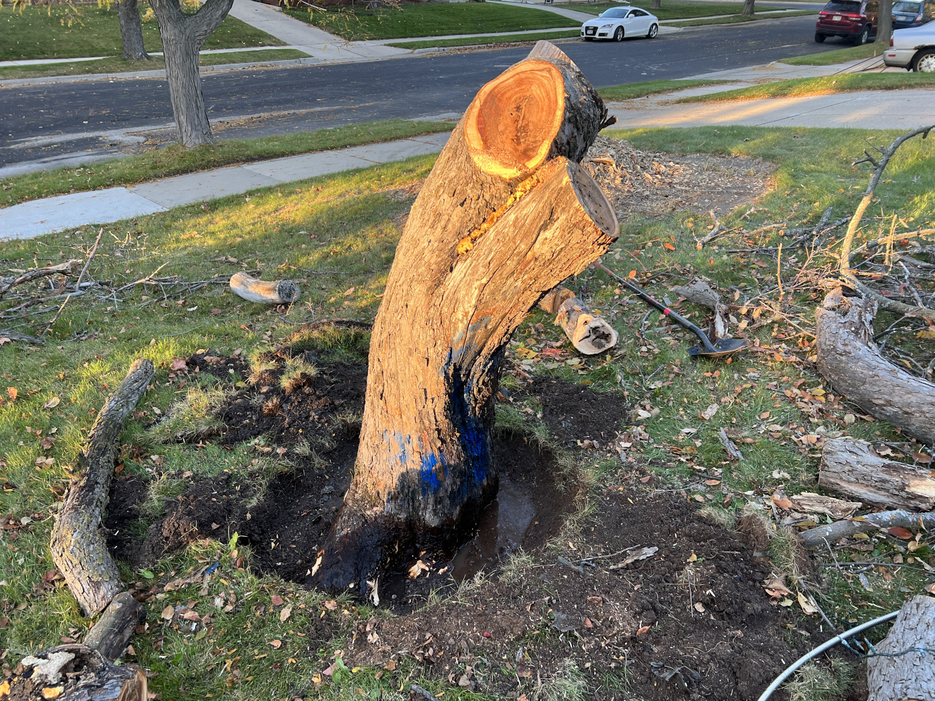 1. Это не наше дерево. Это в парке. Мы второй раз заказываем спилить дерево. Первый раз это был клён, в этот раз ель. Оба раза мы заплатили 1000 долларов за каждое дерево. Ну вот это на фото, думаю, будет 4-5 тысяч.