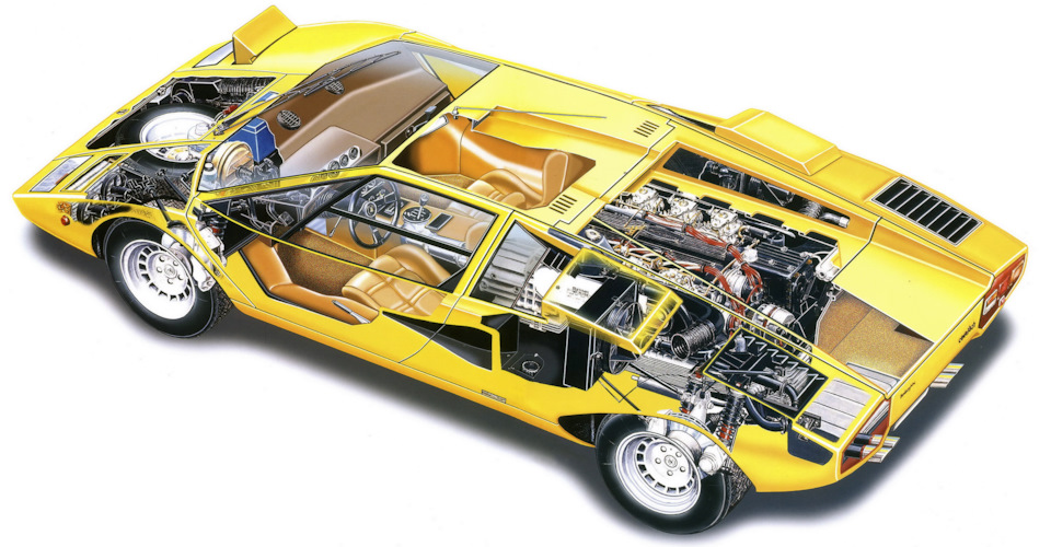 Преемник Миуры (заводской индекс LP112) остался заднеприводным и среднемоторным, а V12 разместился продольно. Но дизайн… Countach до сих пор поражает поражает своим угловатым внешним видом, а тогда… Фронтовой истребитель! Автор — всё тот же Гандини. Сегодня Countach сложно назвать дизайнерским шедевром. Зато двери у суперкара открывались вверх, а не вбок, как у Миуры. Даллара над этой машиной уже не работал, но в строю остались и Станцани, и новозеландец Уоллес.