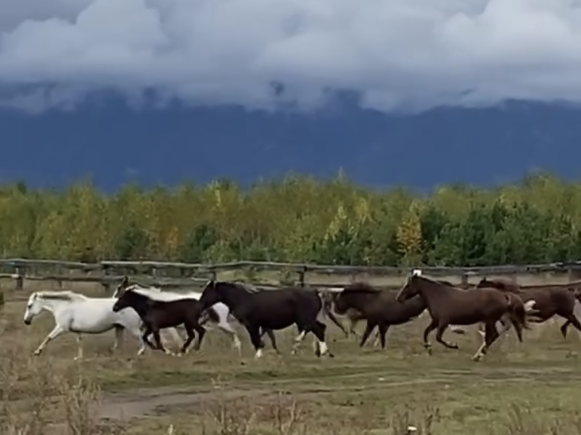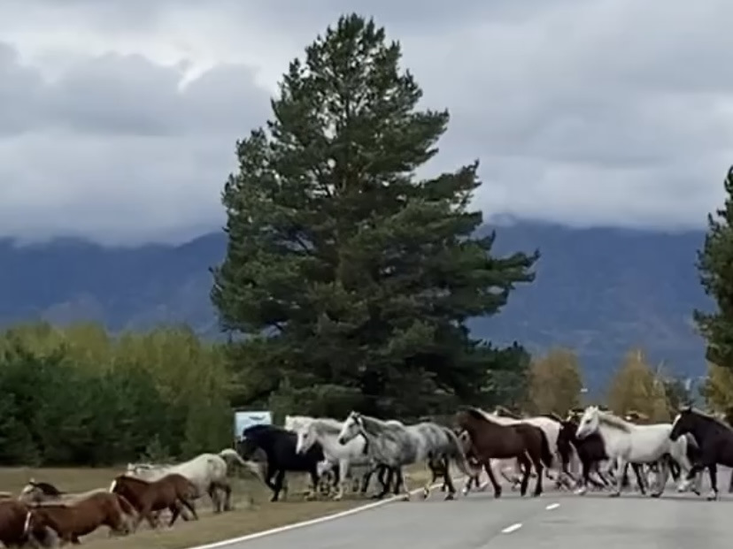 Бегут кони через дорогу, плещутся гривы, стучат копыта. Уносятся в сторону деревни, подгоняемые пастухами.