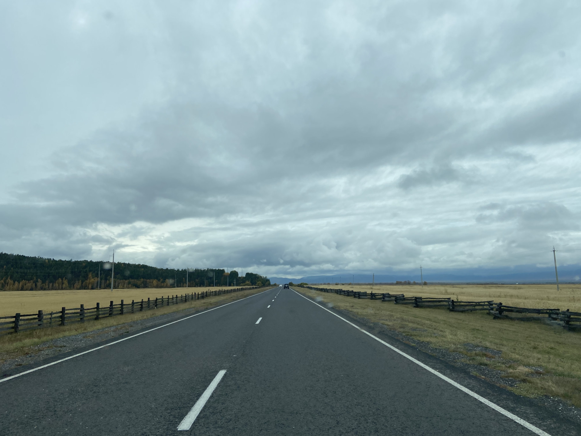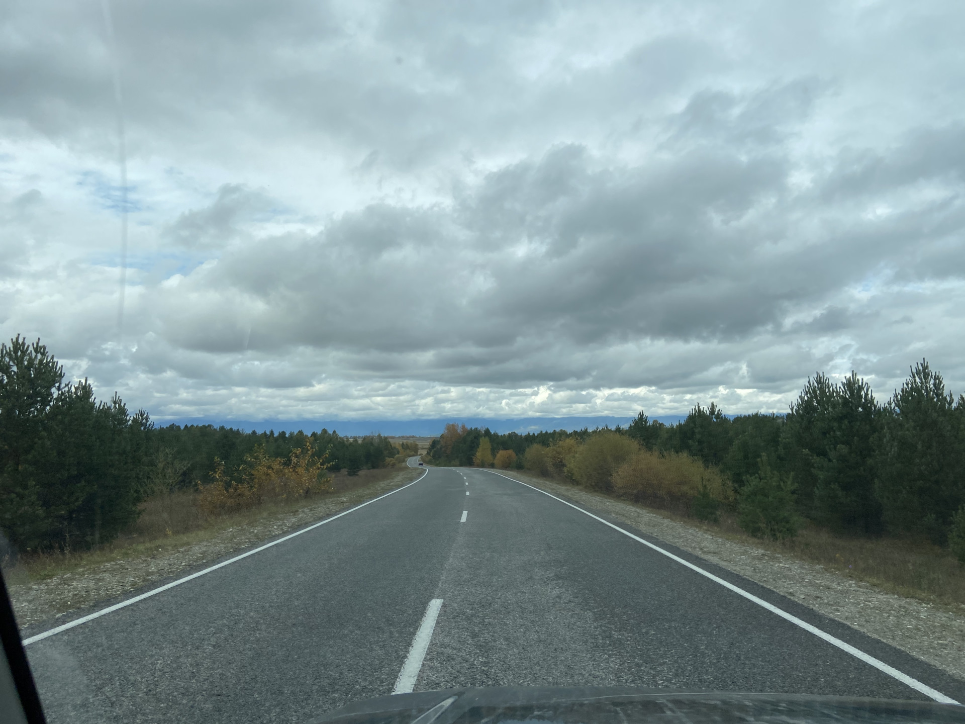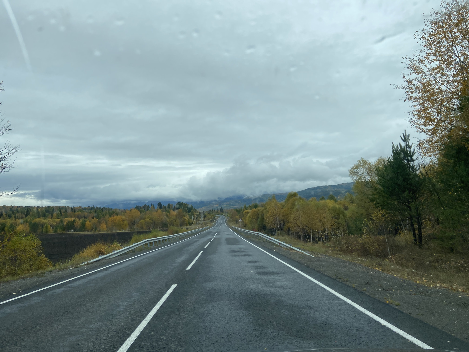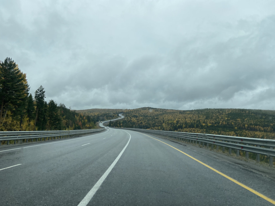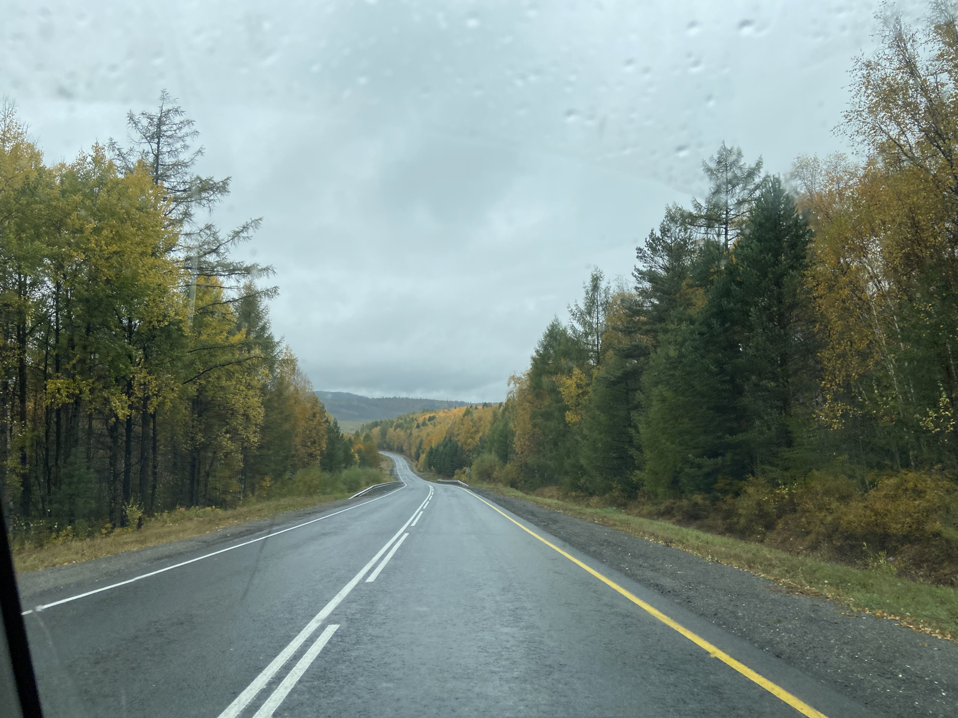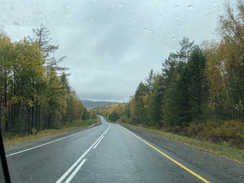 Дорога бежит вдаль, петляет среди сопок. Зелёно-золотых, осенних. И серая туманная хмарь только подчёркивает краски леса.