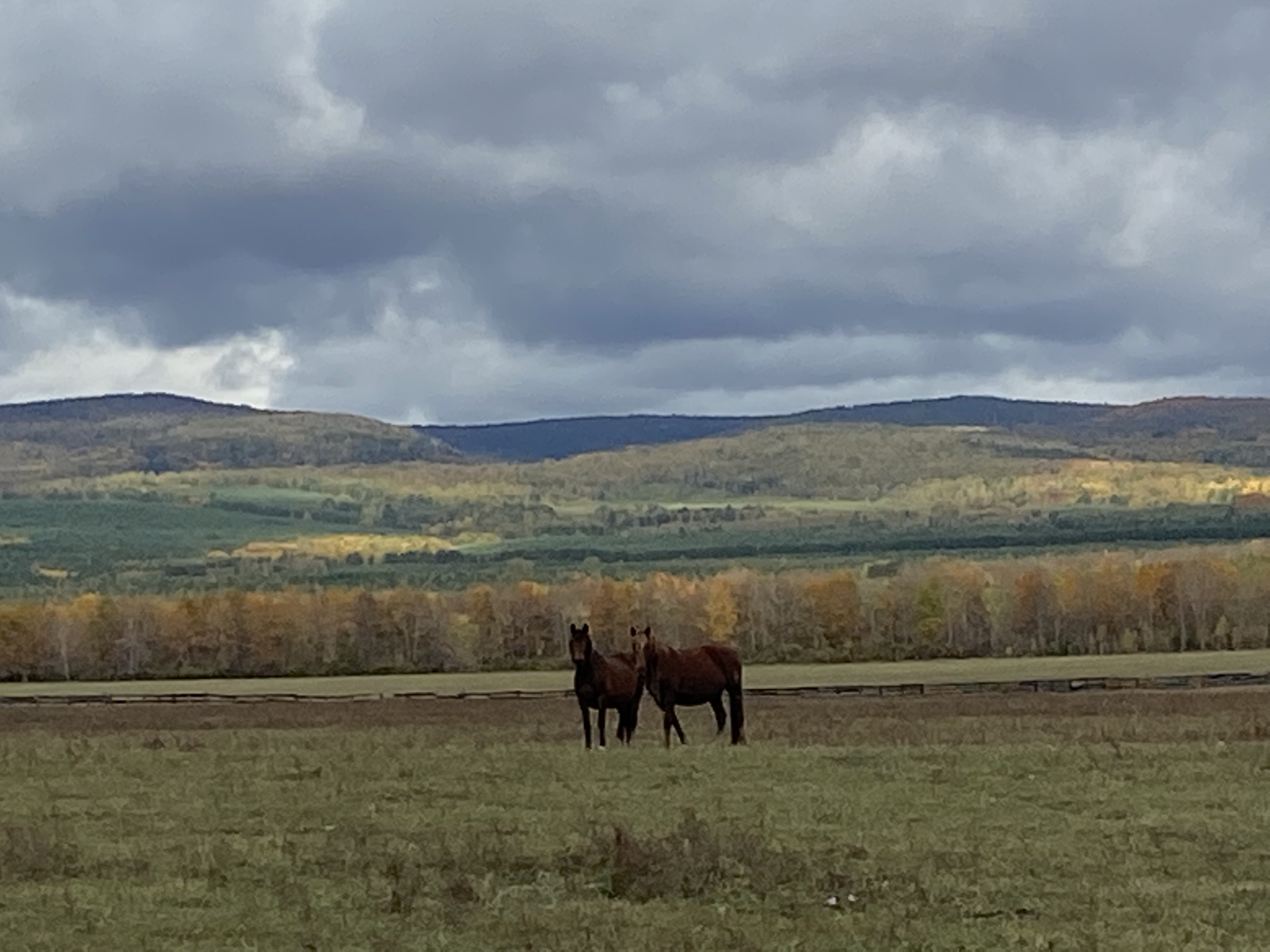 Пройтись в поле. Виды как на картине — горы укрыты облаками, осенний лес вдалеке и пасущееся стадо.