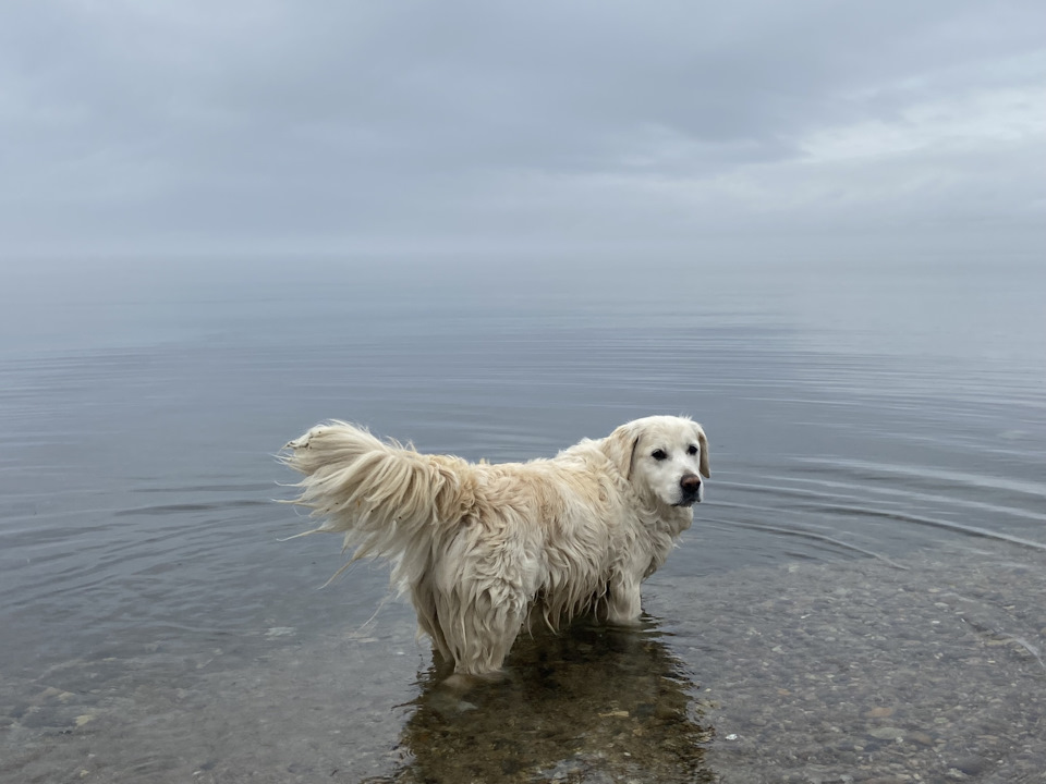 Собака Грей, побродив под дождиком, решил промокнуть окончательно и залез в воду. Пришлось потом заехать на Почту России и купить ему полотенце. Почему на Почте? Так получилось.