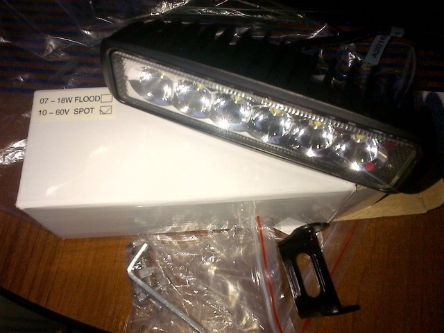 Приобрел на e-bay китайские фонарики, круглые, диаметром 70мм (площадь 38,5см2, если намерять диаметр 72мм, то будет ровно 40см2 :) ), по 9 полуваттных светодиодов Super Flux в каждом. Примерно таких: