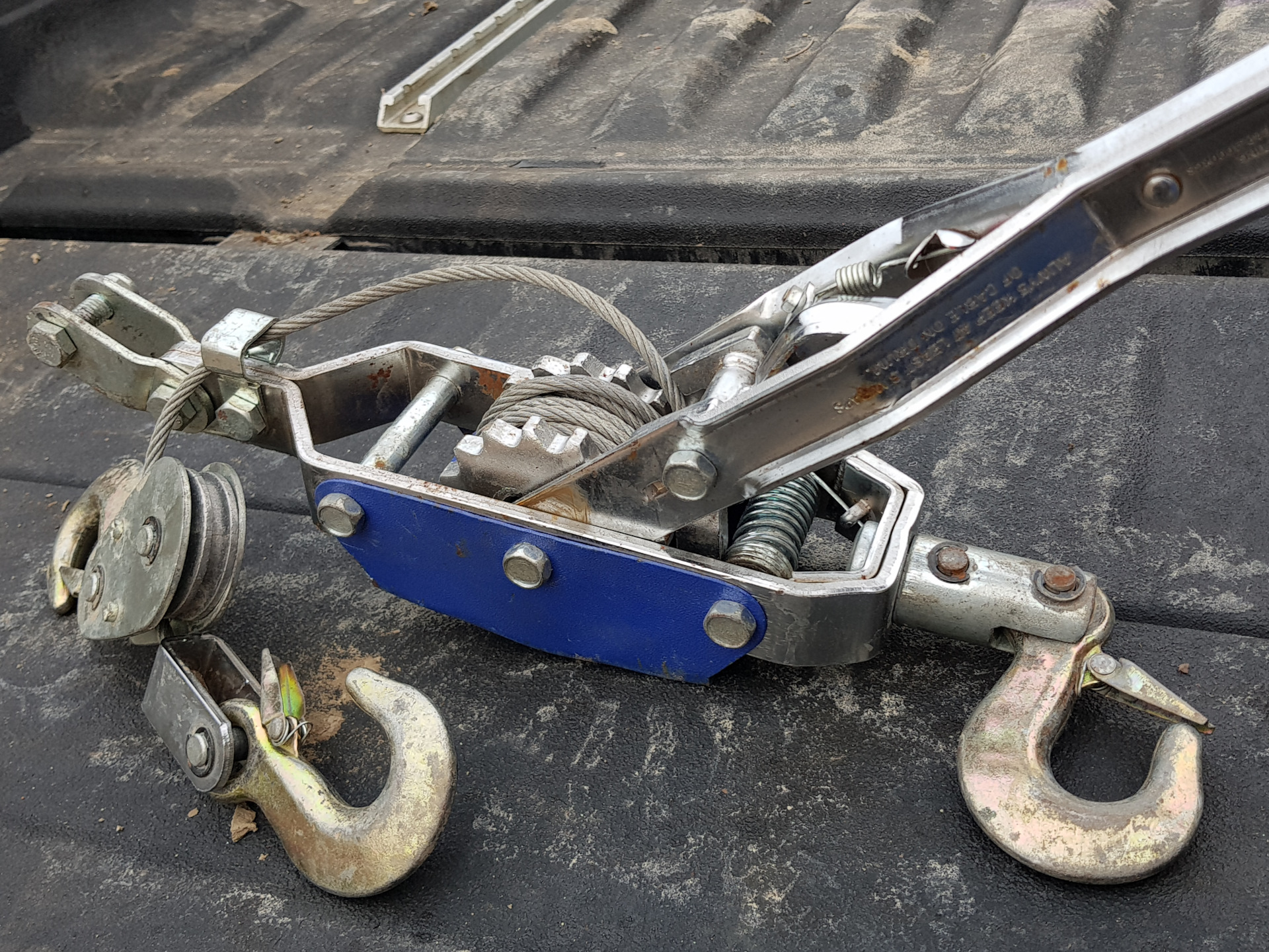Тут мне подумалось, что наверное и стропа с храповиком лишней не будет (ну, типа ручная лебедка, или как это там на джиперском?). Только не всегда рядом есть дерево или иной подходящий упор. И длины троса тоже может не хватить.