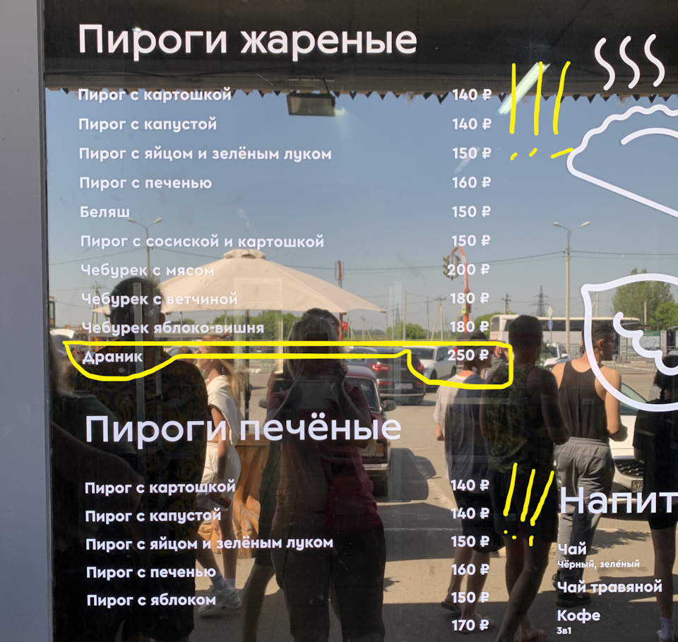 А сейчас и очередей нет, но драник с мясом стоит аж 250 р., а простой пирожок с капустой 140 р. От таких цен у меня изжога…😳😳