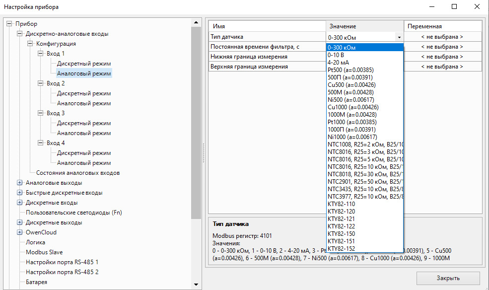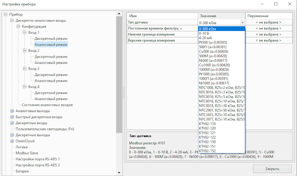 Как пример, Аналоговый Вход, он может быть и Аналоговым, и Дискретным! В Аналоговом режиме по умолчанию вы можете выбрать тип датчика, например 4…20мА или 0-10В, выбрать готовый датчик NTC, PT, или же просто делать измерения сопротивления до 300кОм!