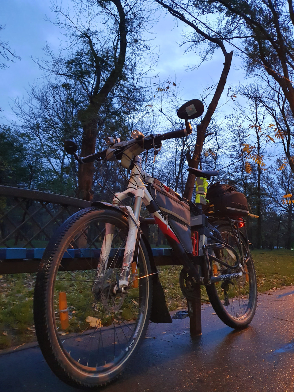 В снаряжённом состоянии, с замком (1,6кг), фарами, задними фонарями, крыльями, багажником, ЗИПом и задней сумкой (1,2кг) получилось 20 кг.